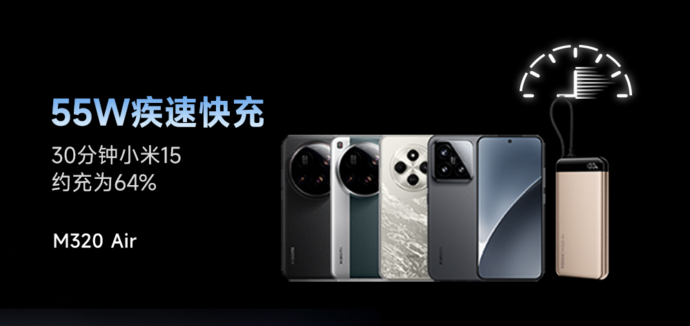 米物M320 Air支持小米55W澎湃秒充,30分钟即可为小米15充入64%电量,并且全面适配苹果、华米OV、大疆等主流厂商的手机、平板及智能穿戴的快充。这一配置超越了市面多数22.5W-40W功率的同类型产品,让大容量充电宝真正拥有“充电不等待”的高效体验。甚至可以直接给轻薄笔记本充电!关键时刻办公不掉链!