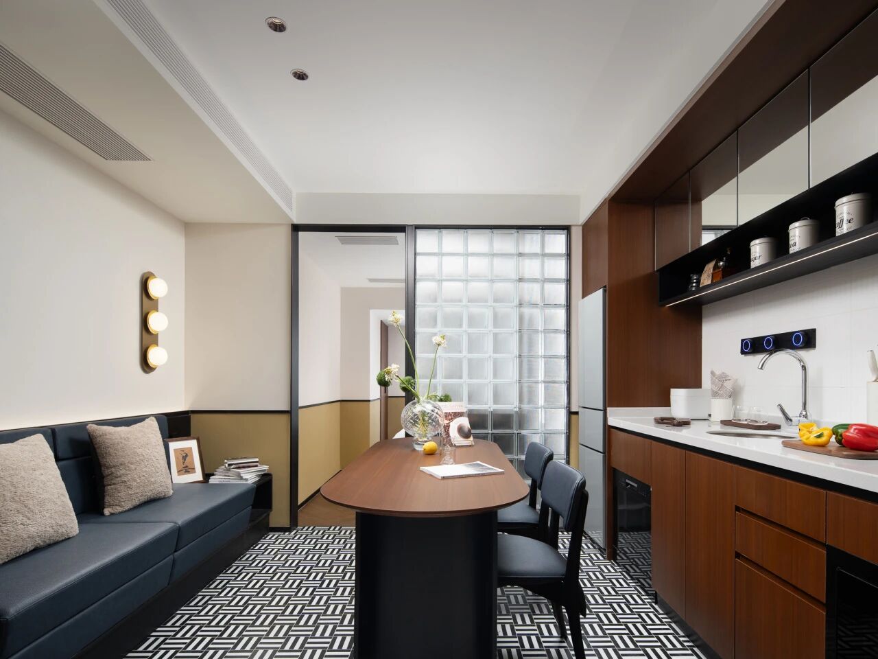 比如华住城家旗下的服务式公寓品牌,配备了简配厨房或开放式标准厨房、洗烘一体机、标准尺寸大冰箱、大容量储物空间,既能满足多人居住的空间需求,又能提供烹饪、洗衣等居家功能。