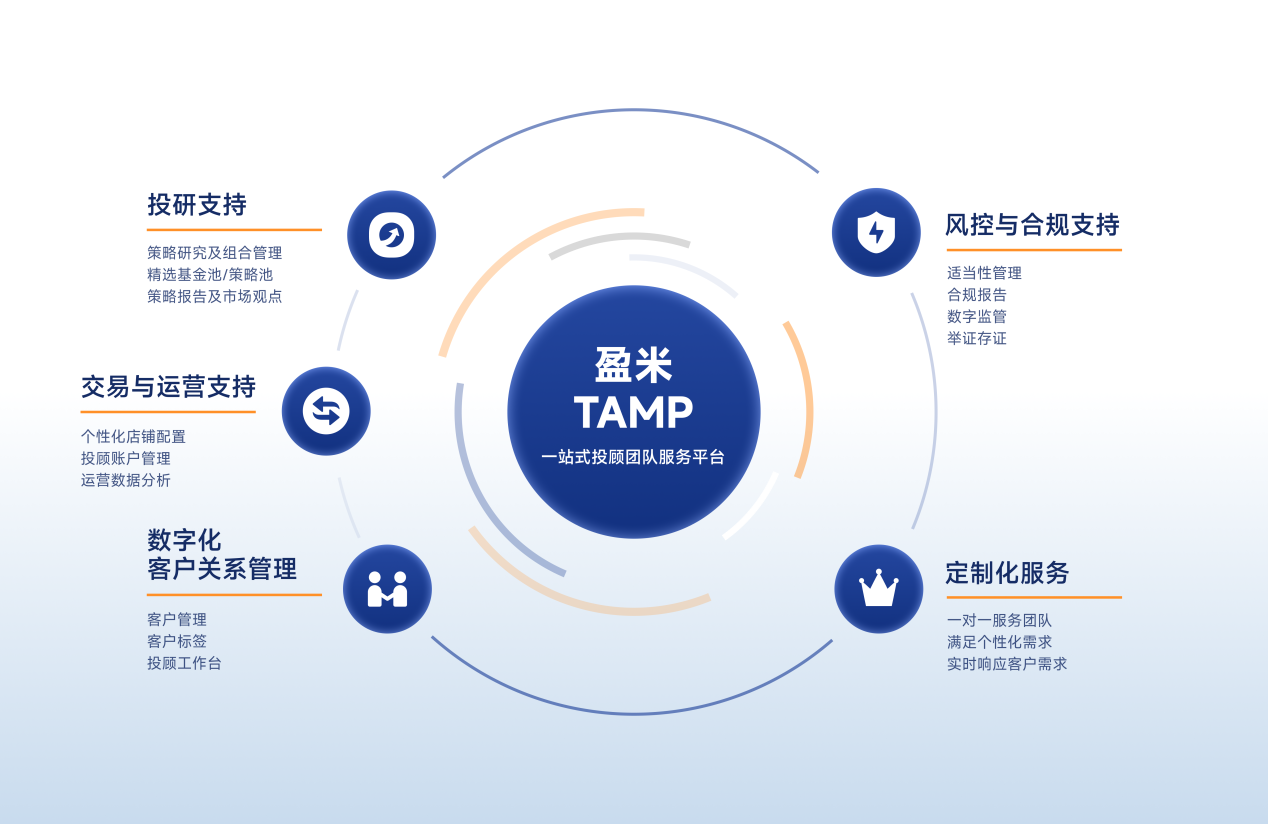 盈米TAMP现已建立了以“买方立场、账户视角、资金规划和资产配置”为核心的一站式数字化投顾服务平台,通过AI大模型技术和大数据技术,围绕投顾服务流程构建端到端的投顾服务体系,推出了专为投资顾问量身打造的投顾工作台、投研工作台、投顾内容生产平台和账户管理平台等一系列数字化工具,为投顾业务的规模化发展提供了强大的系统支持。