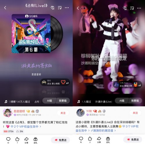 《音乐缘计划2》自10月24日开播后收获了许多爆款歌曲,刘宇宁和周深带来《自诩周全》《扑通扑通》等风格迥异的歌曲;薛之谦带来《平庸》引发“不断气翻唱挑战”以及“催泪爆款”《农民与土地》;谭晶演绎的《忙茫盲》创新性融入多元潮流音乐元素,实现了经典与先锋表达的巧妙融合。这些作品不仅凭借多元风格和动人演绎霸榜各大音乐平台,还引发了社交平台的热议。节目歌单一经发布,也在全民K歌上掀起了一股翻唱热潮,迅速涌现出许多优秀的翻唱作品。如 K 歌网友“是甜甜呀”使用“VIP 音效”和“录唱皮肤”翻唱欧阳娜娜在节目中的《占有》,细腻的声线搭配沉浸式音效,让这首温柔的歌曲多了几分专属的治愈感,也让普通听众拥有了和舞台同款的演唱体验;K 歌网友“YI 秋”翻唱了周深的《扑通扑通》,在“VIP 音效”“VIP 伴奏”“VIP 音质”三重功能的加持下,不仅精准还原了歌曲里灵动欢快的氛围,更让歌声拥有了和舞台 Live 同款的通透质感,成为全民 K 歌平台上的热门翻唱作品。