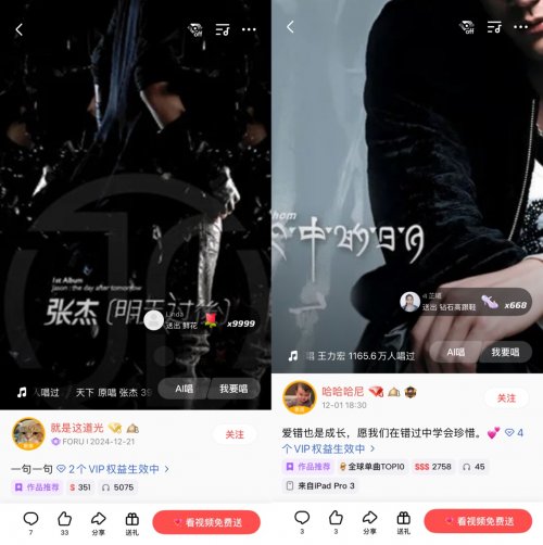 近年来,越来越多音综走入大家的视野,也带火了一首一首经典歌曲,同时也引发了乐迷们的翻唱热潮。如K歌网友“就是这道光”翻唱了《声生不息》中张杰的《天下》,在“VIP音质”和“录唱皮肤”的双重赋能下,不仅让歌声的层次感和穿透力拉满,个性化的录唱皮肤还为翻唱增添了专属风格;K歌网友“哈哈哈尼”在“VIP音效”“VIP伴奏”“VIP音质”及“录唱皮肤”四重功能辅助下翻唱了王力宏的《爱错》,完美解锁沉浸式翻唱体验。