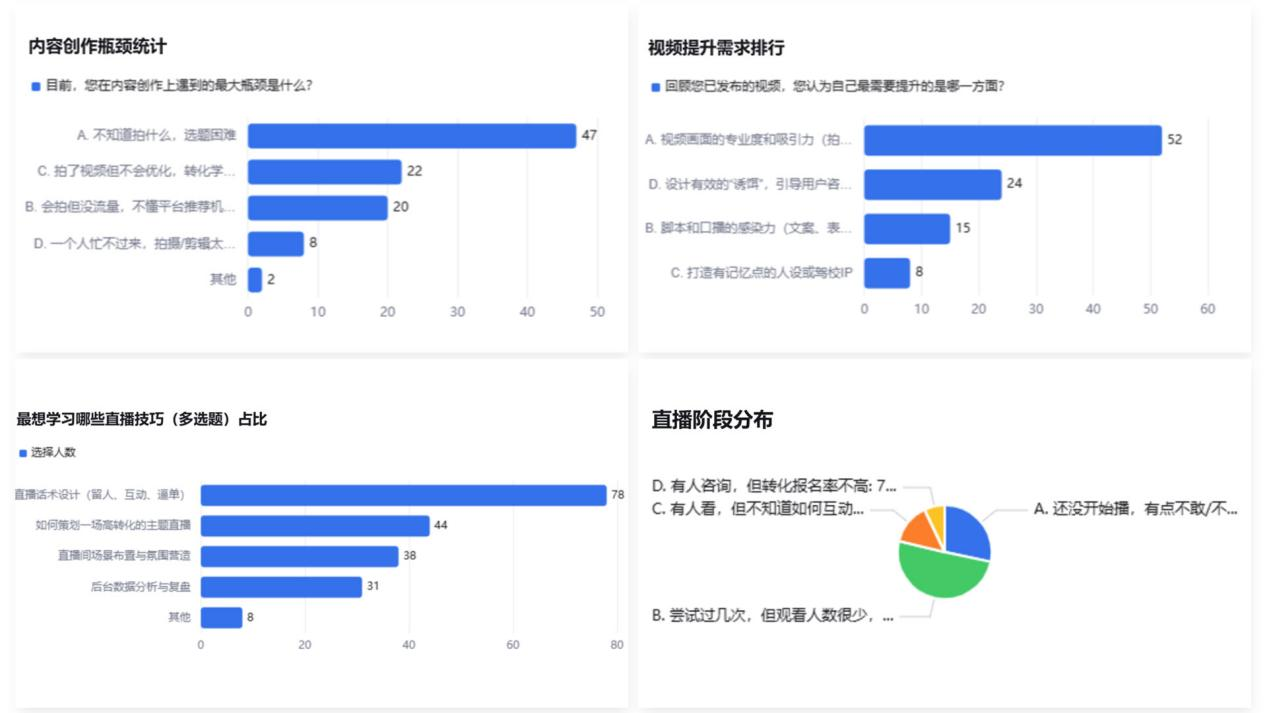 大象驾到新媒体学苑在培训前对学员开展深入的问卷调研与需求剖析,收集问卷100余份。针对学员在内容产出、直播转化、数据分析等薄弱之处,提供易上手的内容产出方式论与实战训练,切实做到“教其所缺、训其所需”。
