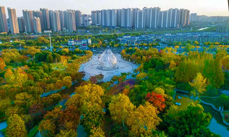 沿着小径一路行走,园内落叶乔木众多,独树成景,形成独有特色。多种树木层林尽染,挺拔的树形和黄色、红色的叶色构成一道亮丽的风景线。高空俯瞰,就像巨幅油画,吸引着众多市民来此休闲、健身、拍照。美景中,大人带着孩子玩闹,更是一种景中景、画中画。远处,还有不少幼儿园的小朋友也来到这里游玩,留下一片欢声笑语。