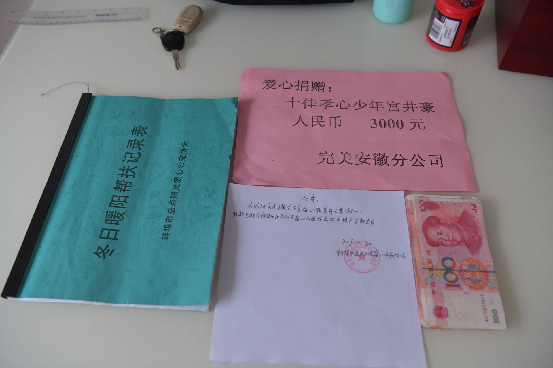 完美安徽分公司工作人员介绍,在从蚌埠日报淮河晨刊看到宫井豪的事迹后,他和同事们都很受感动。父亲病逝,母亲重疾,三个孩子相依为命。宫井豪和姐姐一起用弱小的肩膀撑起家庭重任。宫井豪现就读于仁和中学,三年前,母亲被查出患上了尿毒症,高昂的治疗费让这个原本就不富裕的家庭陷入困境。祸不单行,2018年年初,父亲因患急性白血病离开人世。家里唯一的顶梁柱倒了,妈妈又丧失了劳动力,从那以后,宫井豪成为家里的“小巨人”。