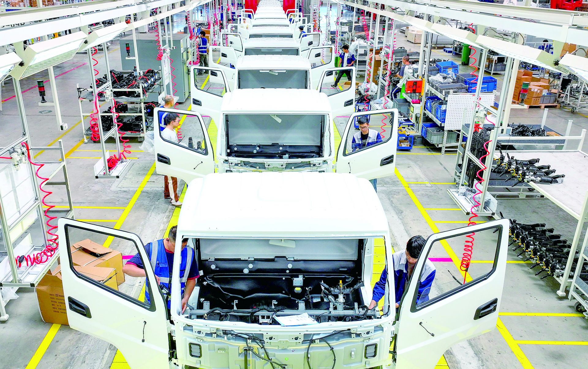 10月9日,工人在贵州省贵安新区贵州长江汽车有限公司生产车间作业(无人机照片)。