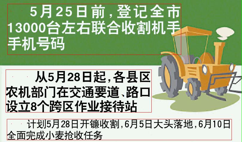 按照农业部门的计划,5月28日小麦开镰收割,6月5日大头落地,6月10日全面完成小麦抢收任务。县区农机部门将在5月25日前把全市13000台左右联合收割机手的手机号码进行登记,及时把农机跨区作业证发放到农机手手中,引导联合收割机有序流动。从5月28日起,各县区农机部门在交通要道、路口设立8个跨区作业接待站,组织机械合理流动、有序作业,同时成立小麦抢收应急服务队,全力做好小麦抢收和服务工作。