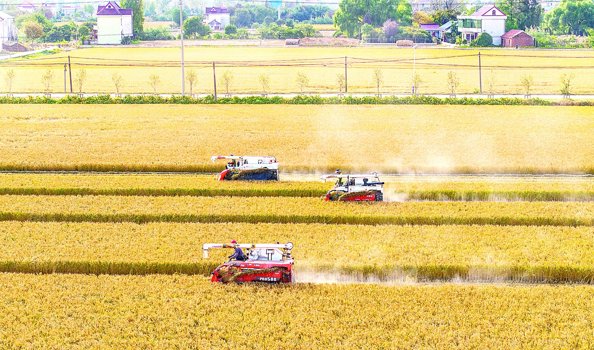 11月3日,江苏省南通市通州区石港镇四港村农民驾驶收割机抢收水稻(无人机照片)。
