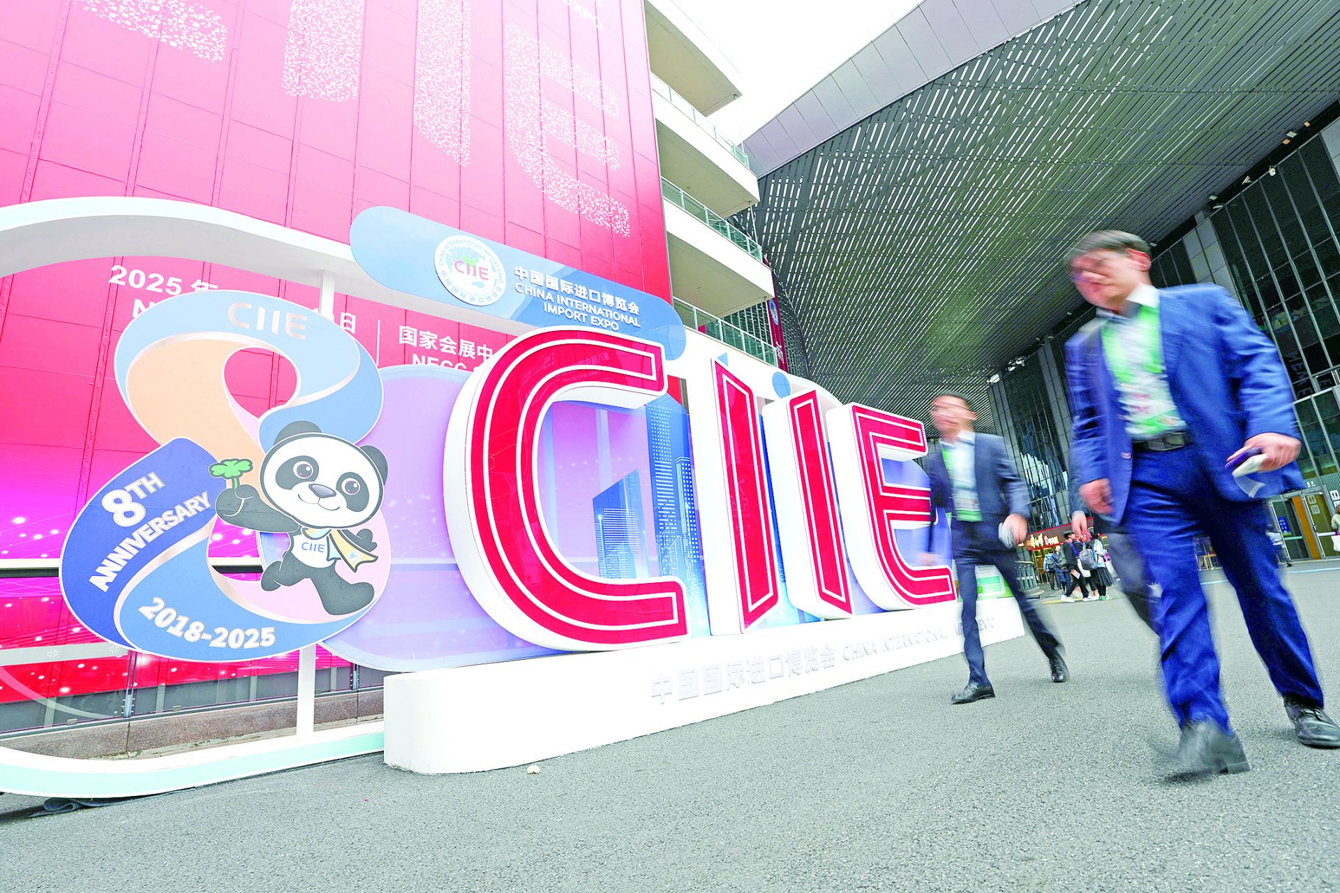 11月5日,人们从第八届进博会主题装饰前走过。