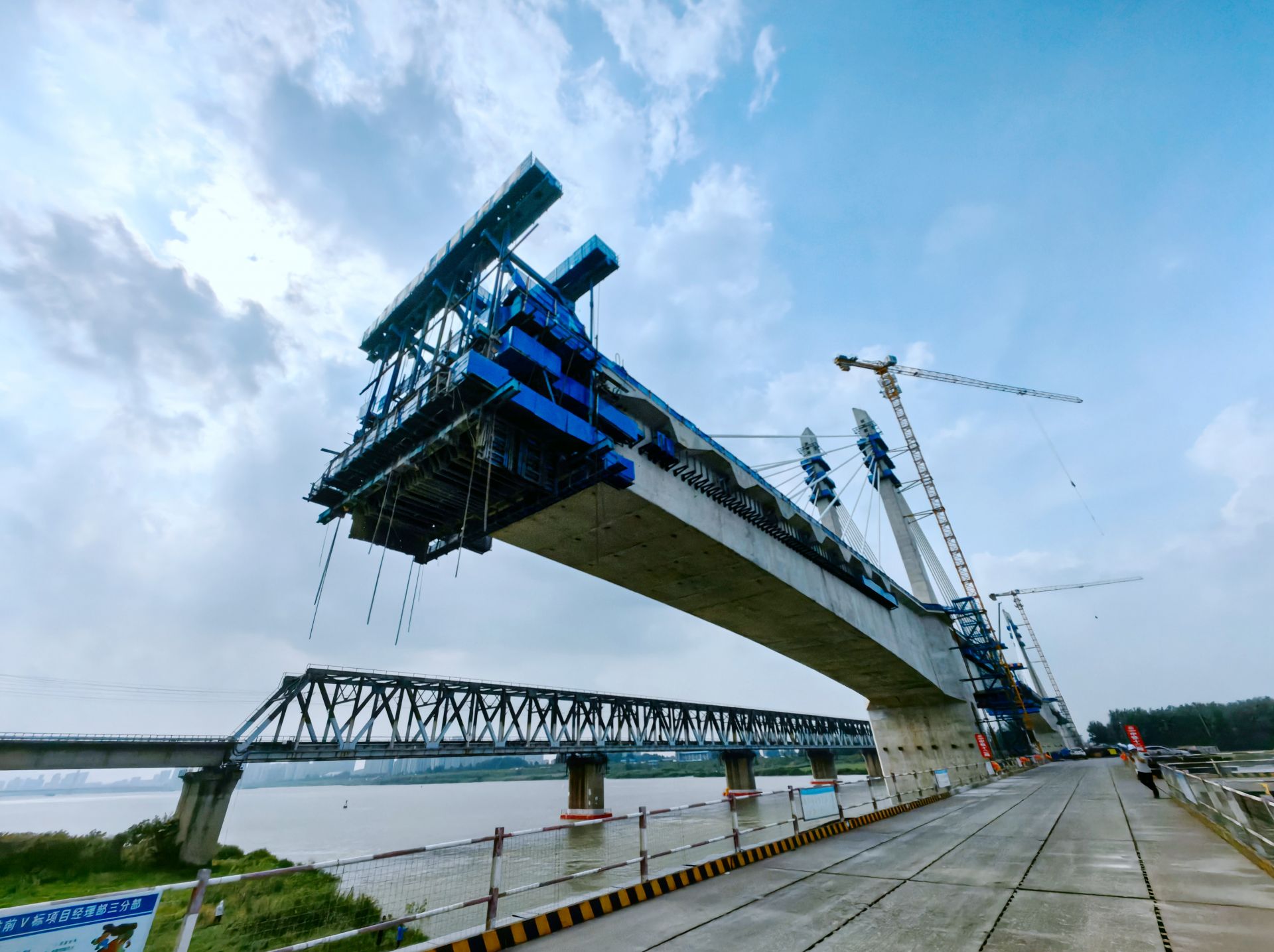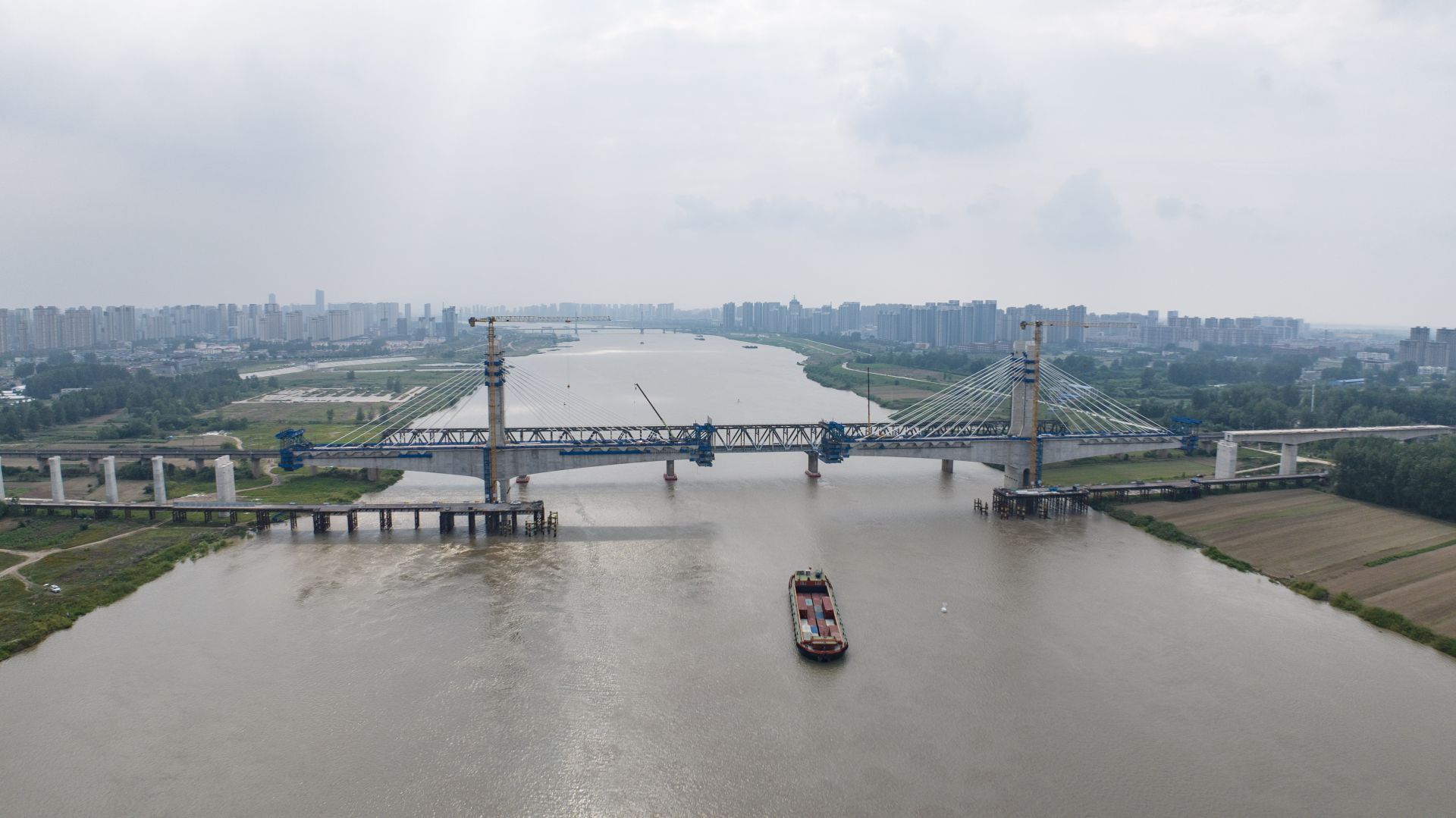 目前,淮河特大桥跨淮河矮塔斜拉桥南北岸各需施工29个节段,其中南岸已完成22个节段,北岸已完成23个节段,两岸各需挂锁10对,其中南岸已挂锁7对,北岸已挂锁8对,施工人员加班加点,克服高温天气,全力以赴,争取在11月份完成全桥合龙。