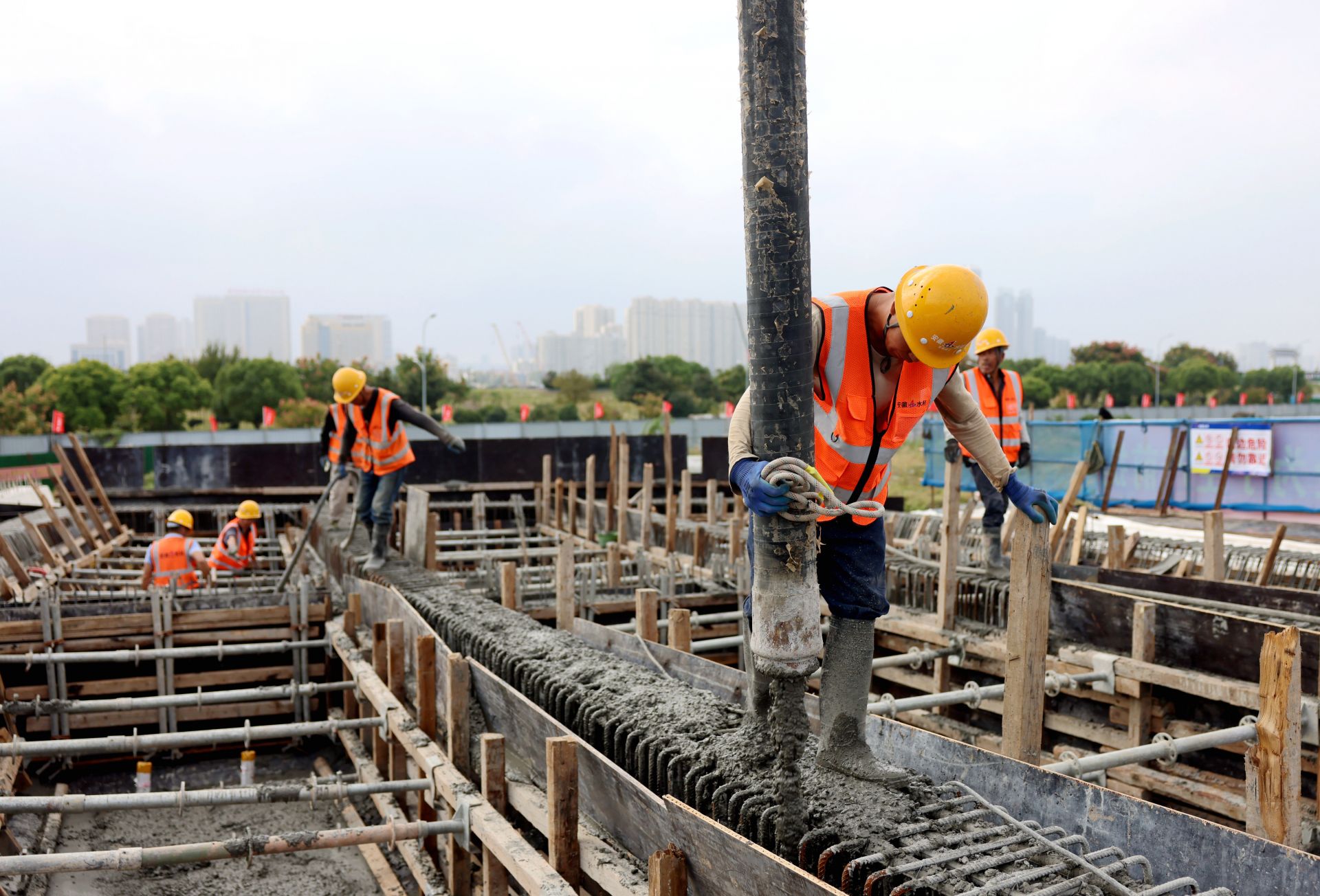 此外,B匝道桥第三联由10号至14号桥墩,共四跨现浇箱梁构成,长度约80米,宽度14.4米。桥梁下部结构采用花瓶墩、桩基础,上部结构为钢筋混凝土现浇箱梁,本次浇筑混凝土方量约500立方,预计需要连续浇筑超过10个小时。据介绍,按照目前施工进度,预计本月底前完成B匝道第二、第三联箱梁混凝土浇筑。