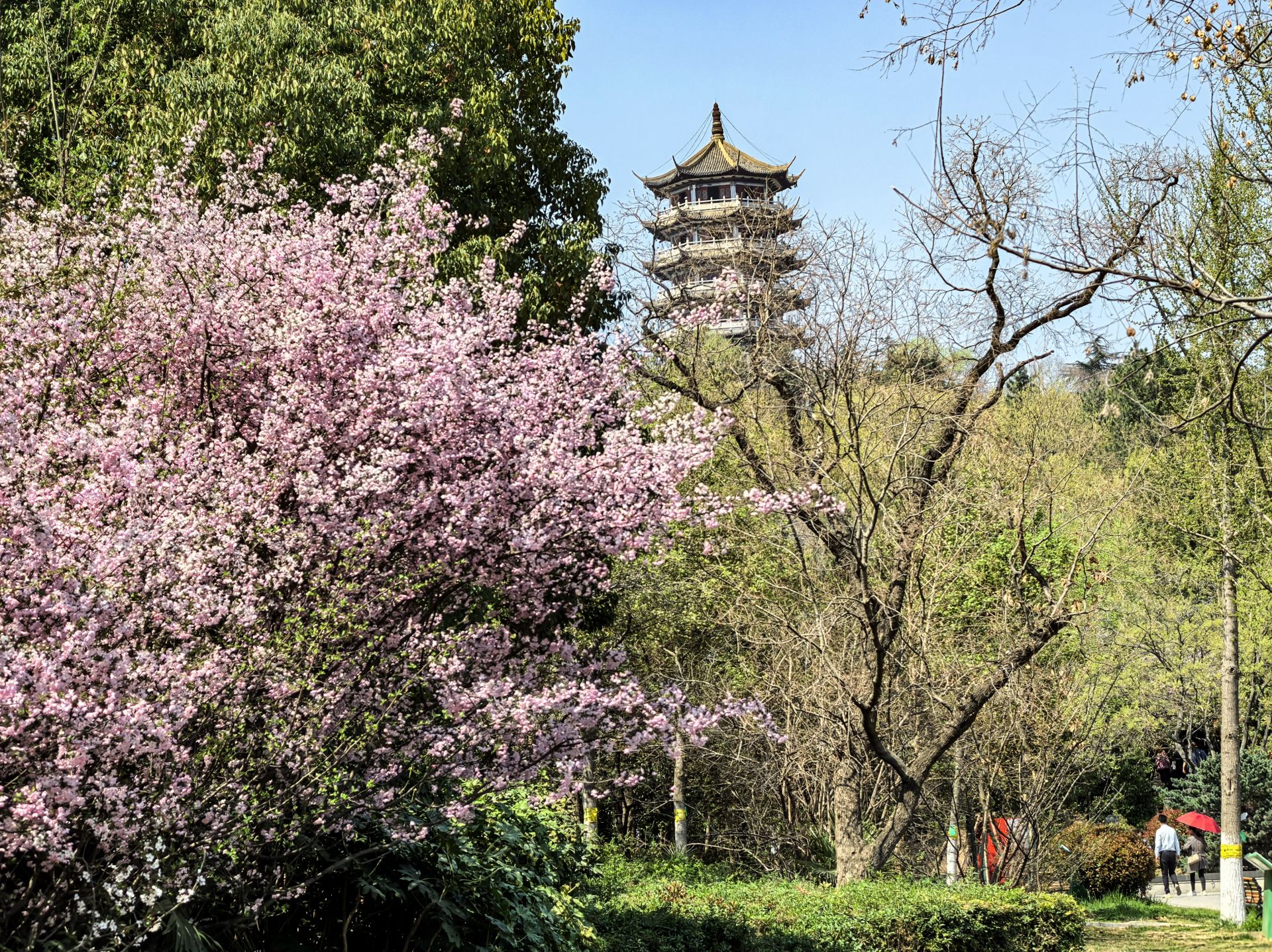 龙子湖公园内桃花盛开,尽显春日蓬勃生机。