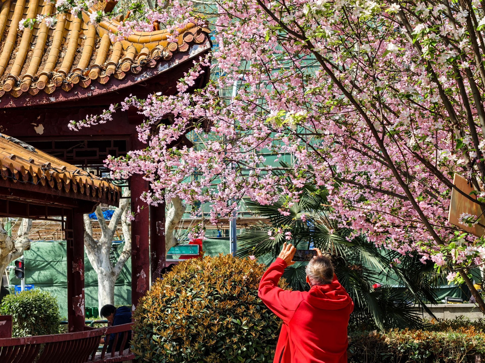 津浦大塘公园西南角海棠花绽放,吸引市民赏花拍照。