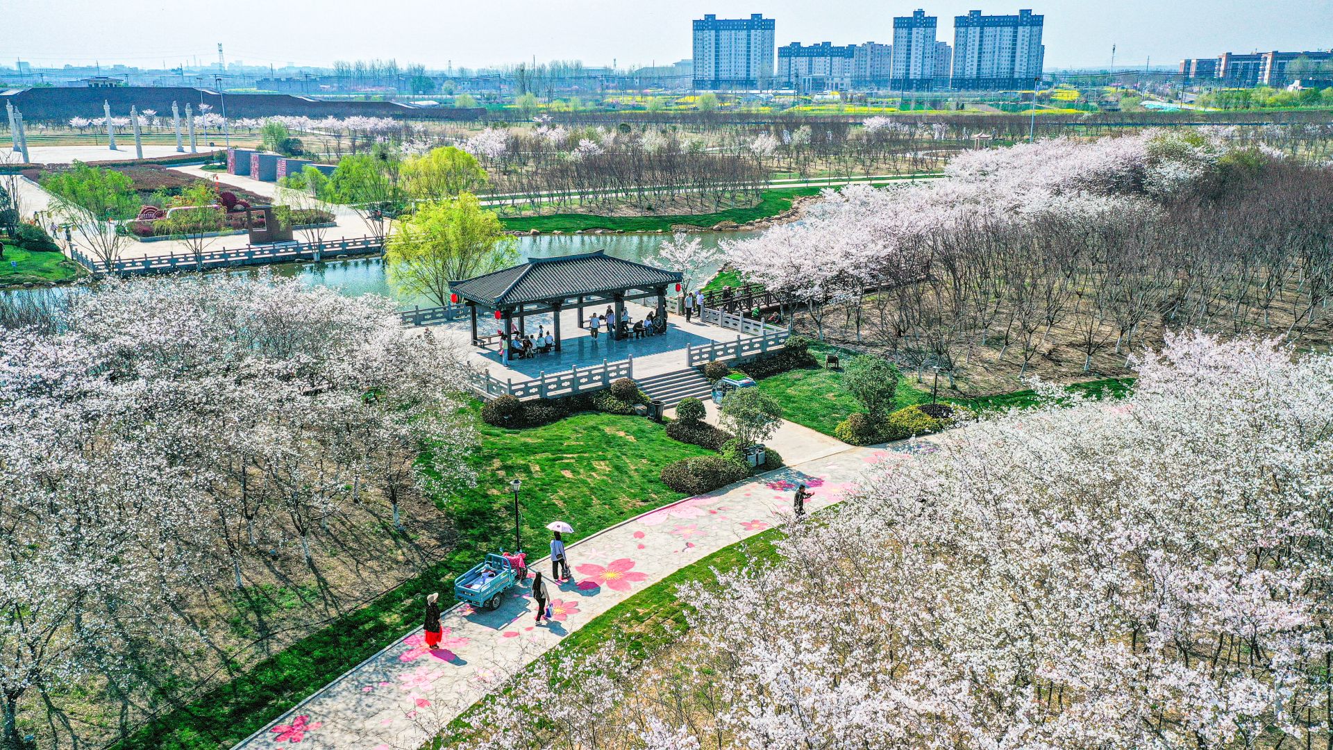 固镇县南城区谷阳城遗址公园内樱花竞相绽放。