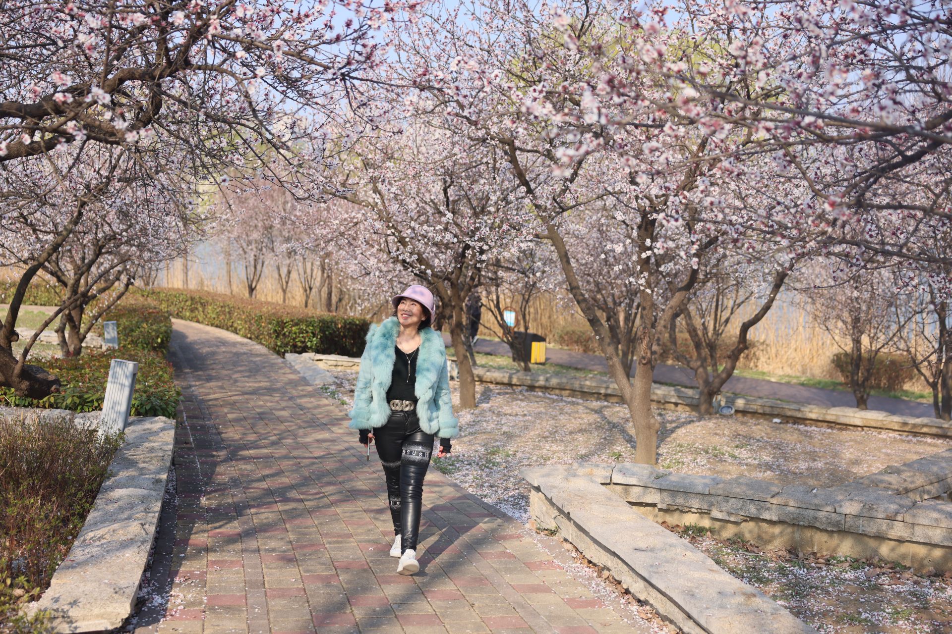 3月26日,南山公园国防教育中心,晨练归来的市民从绿树花丛中走过。