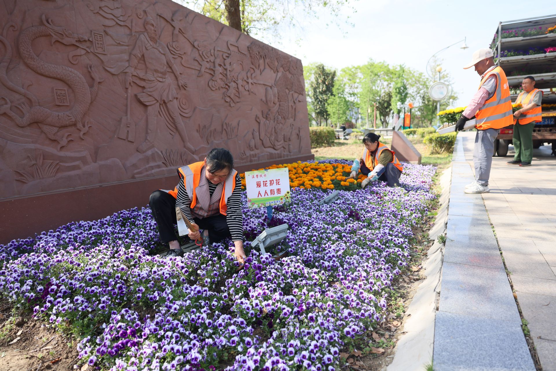 园林人员正在科学宫广场移栽花卉