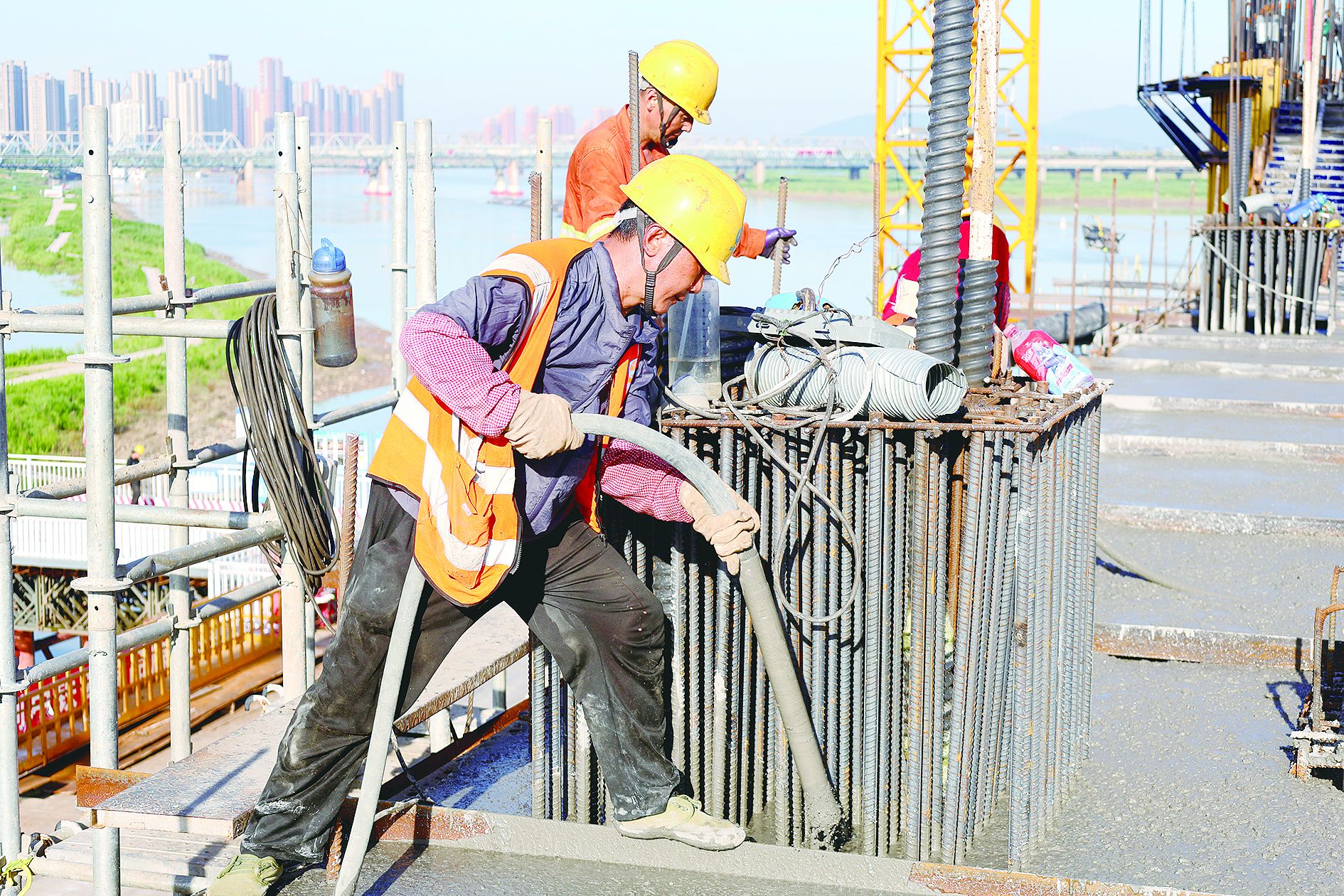 7月2日,延安路淮河大桥及接线工程南岸施工现场,建筑工人正按照施工计划作业。