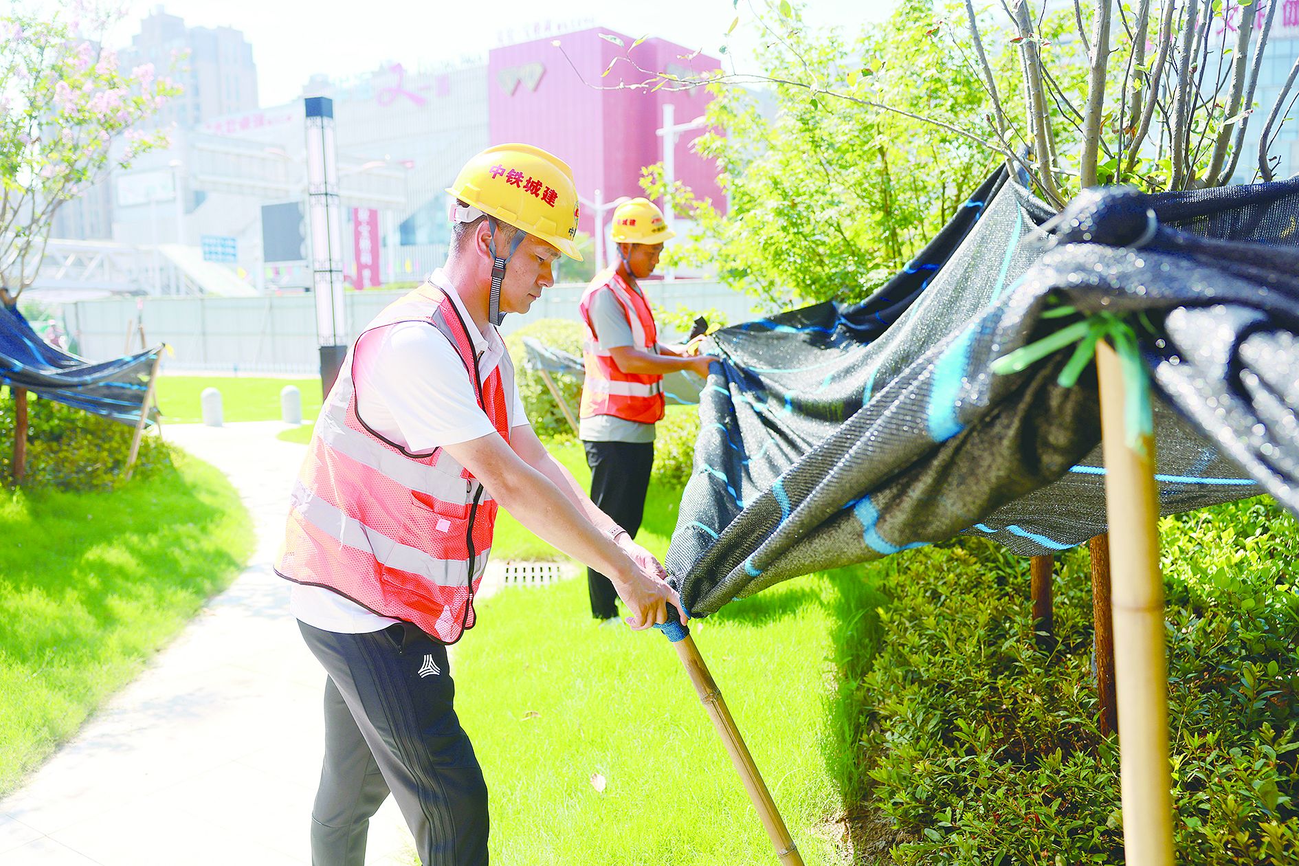7月3日,中铁城建项目工作人员检查胜利二村口袋公园绿化植物覆盖网,确保高温天气植物存活率。