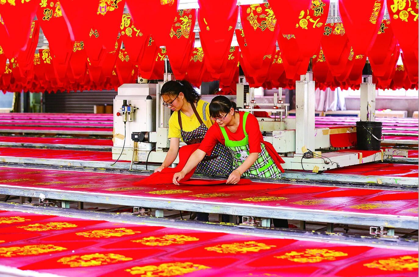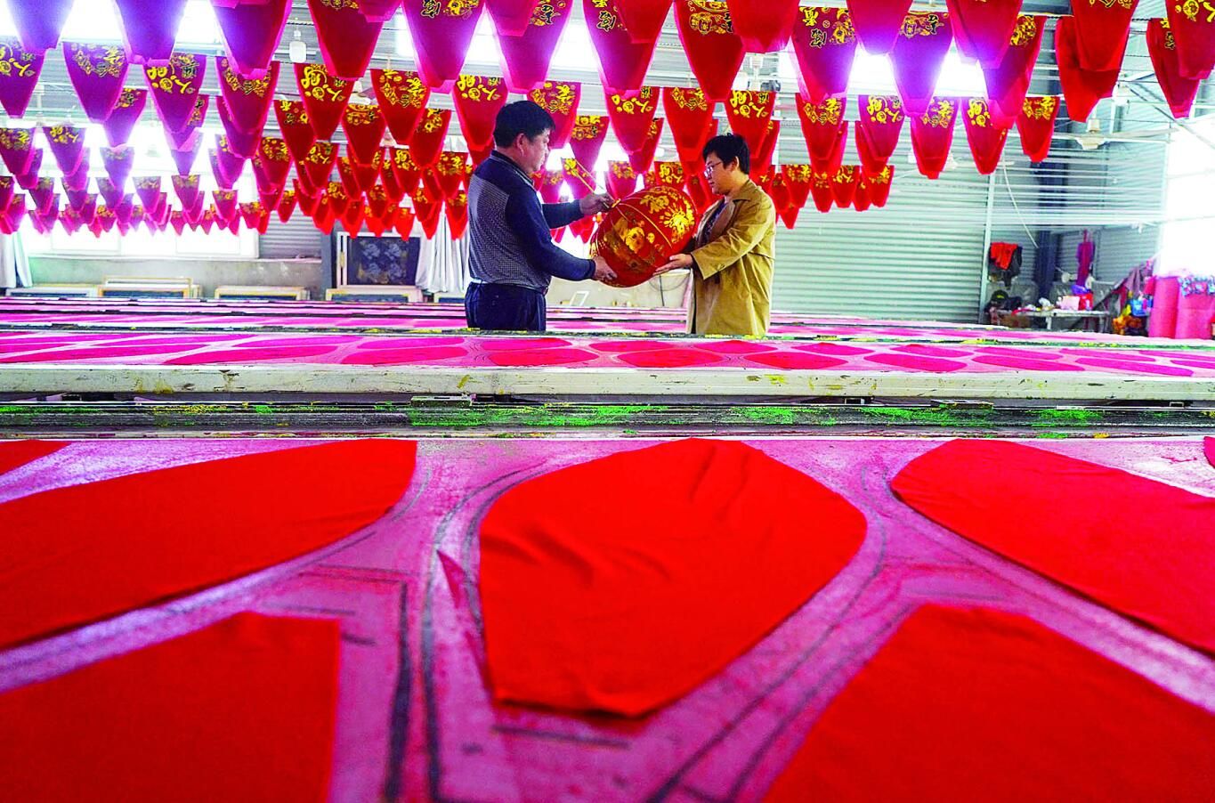 缝红布、烫印花、粘金饰……4月27日,五河县头铺镇郜台村豪彩工艺品加工有限公司车间里机器“隆隆”作响,工人们正在制作大红灯笼。该公司积极带动当地贫困户在家门口就业,进一步拓宽了贫困户的脱贫致富路,目前车间务工人员18人,其中建档立卡贫困户11人。            李向前 摄