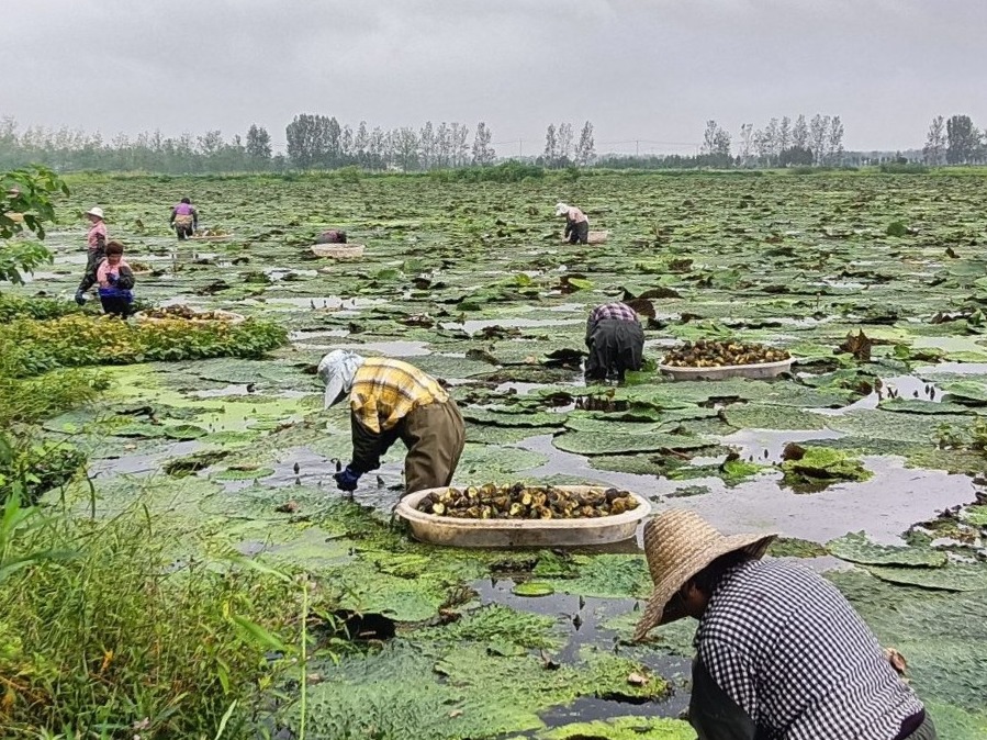 金秋时节,怀远县万福镇陈安村300多亩芡实进入成熟期,农民们带着丰收的喜悦,忙着采收成熟的芡实。碧绿的芡叶层层叠叠,铺满了水田,农民们拨开芡叶,取出芡实,脱壳剥离后,一粒粒圆润的芡实就像“金豆豆”,绽开了农民们脸上的笑容,也鼓起了农民的腰包。村党支部负责人介绍说:“今年芡实喜获丰收,果粒饱满,成色鲜亮,亩产可达150斤,按现在的市场价格来算,亩均可收入4500多元。”