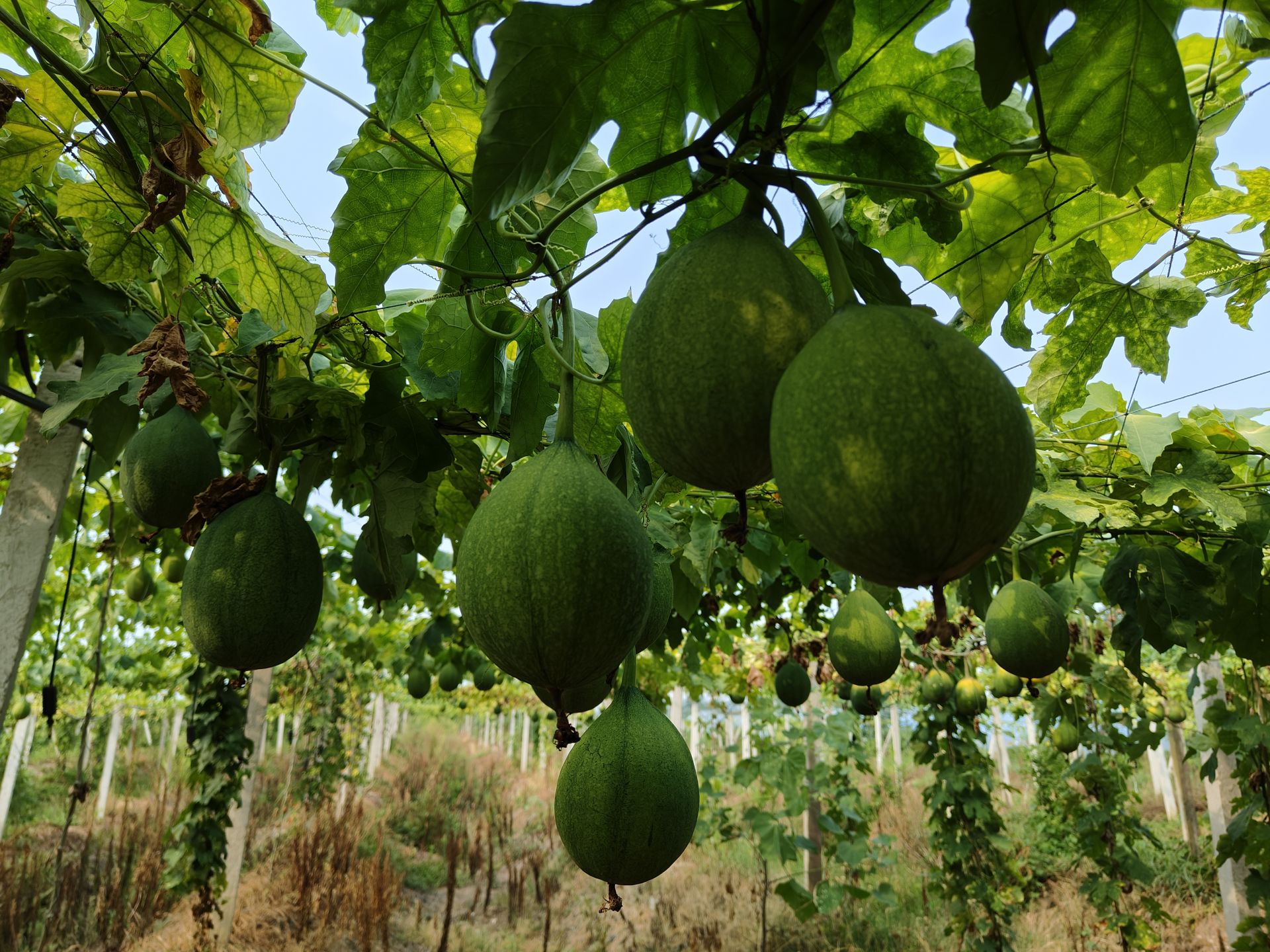初秋时节,安徽省蚌埠市怀远县万福镇镇南村300多亩瓜蒌一派喜人景象,在浓密的瓜蒌架下,圆鼓鼓的瓜蒌坠满了藤蔓,正在进入成熟期。瓜蒌基地负有人开心地介绍说,今年瓜蒌又是一个丰收之年,一亩瓜蒌纯收入可达3000多元呢!这是万福镇种植业特色发展的一个缩影。