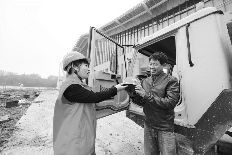 4月23日,体育场社区志愿者为吊车司机送去安全帽,叮嘱其下车后更要注意安全。