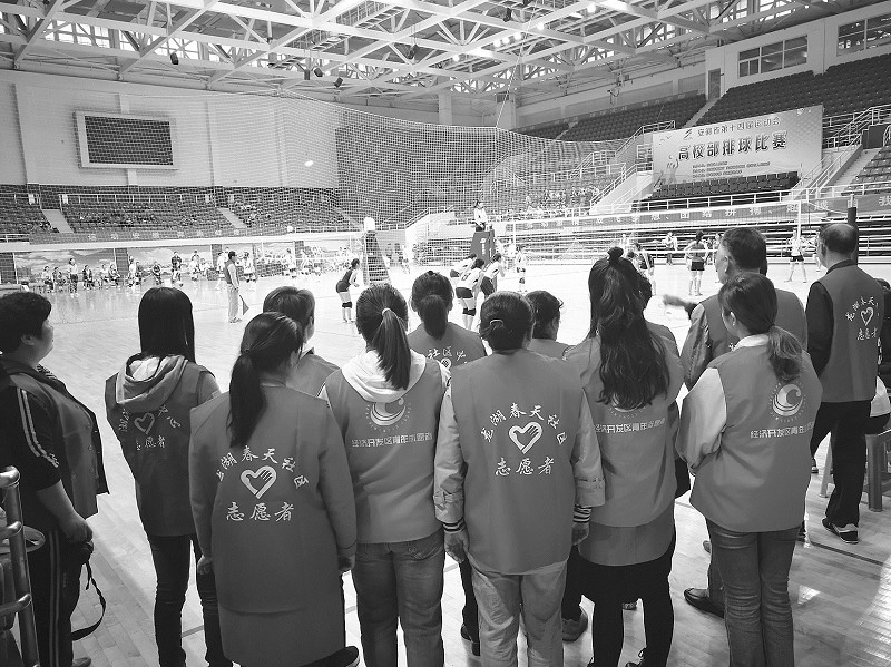连日来,安徽省第十四届运动会高校部比赛如火如荼进行中,省运会体育场馆附近社区组织志愿者走进比赛场馆,为运动员加油助威,为中场休息的运动员做好服务。