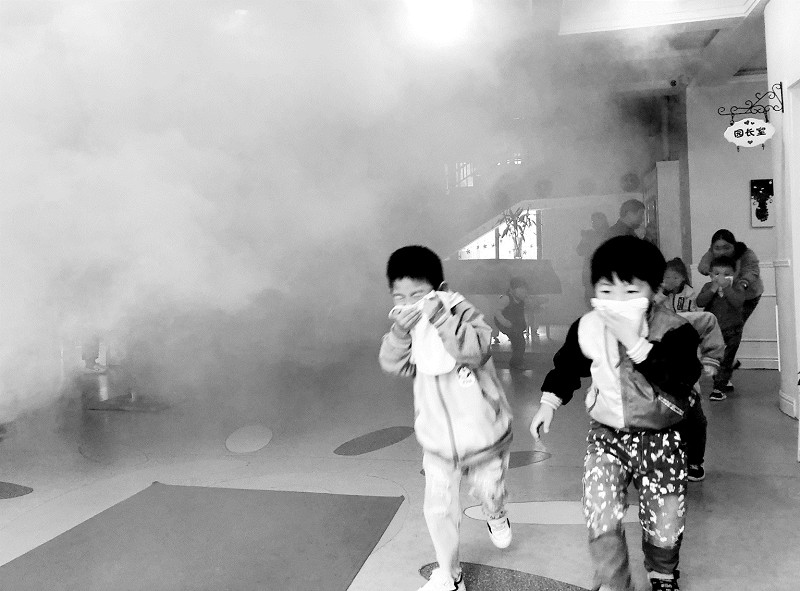 菱湖社区在幼儿园开展消防演练,模拟火灾现场,孩子们捂着口鼻跑出校舍。