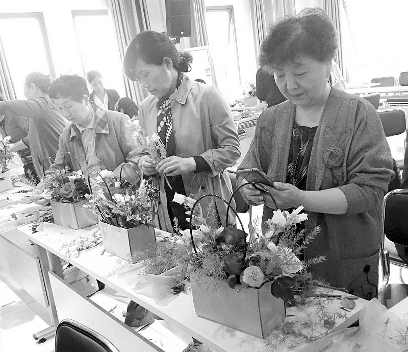 绿地花都社区,居民拿起手机,为自己的插花作品拍照留念。