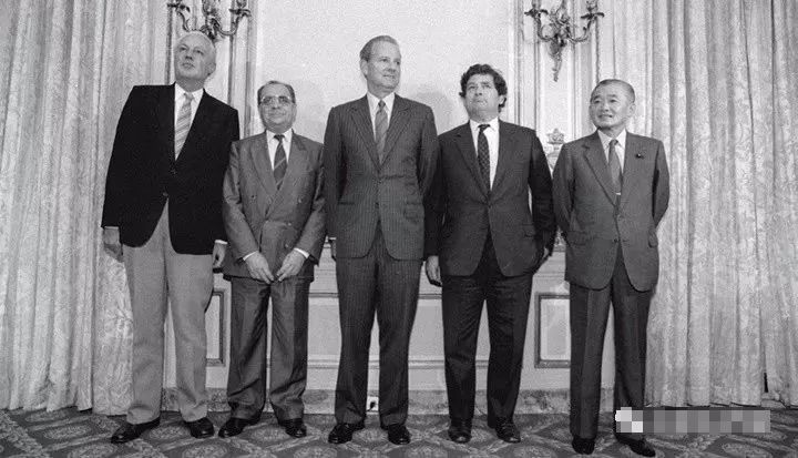 ▲1985年9月22日,纽约广场大酒店,五国财政部长合影