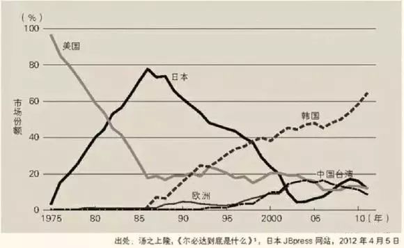 美国政府被吓得不轻,于是出现了1986年的芯片产业协定,日本芯片产业轰一下被击倒。日本人倒下后,因为硅谷超过7成的科技公司砍掉了DRAM业务,韩国人赶紧抓住了这难得的历史机遇,游说克林顿政府只给韩国0.74%的半导体反倾销税,而给了日本100%的反倾销税,韩国半导体从此无比鸡贼的崛起,日本则从此失去这一块重要的科技市场。
