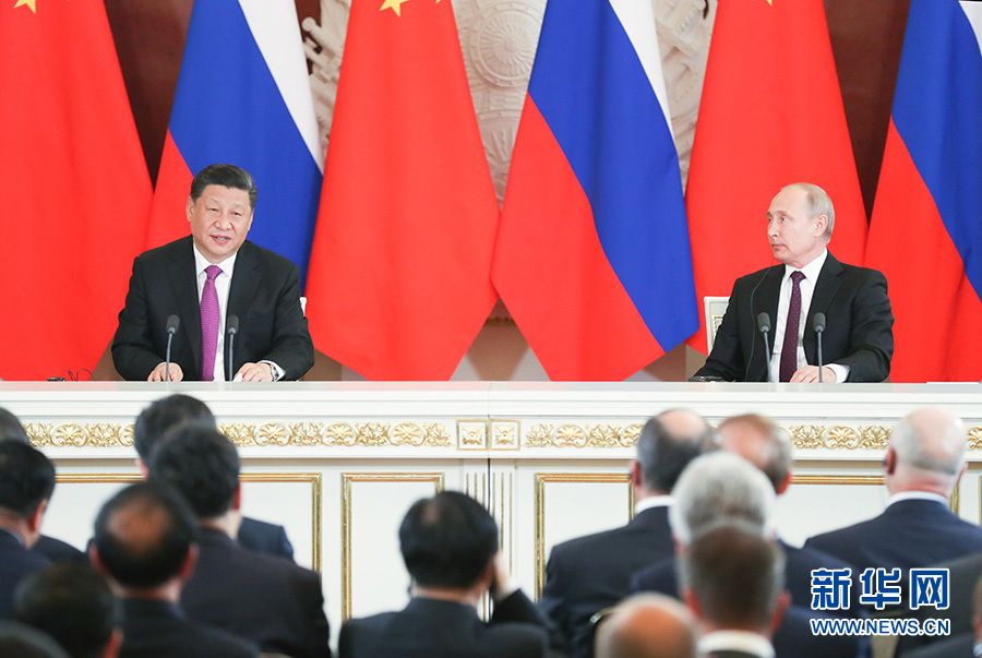 6月5日,国家主席习近平在莫斯科克里姆林宫同俄罗斯总统普京会谈。会谈后,两国元首共同签署《中华人民共和国和俄罗斯联邦关于发展新时代全面战略协作伙伴关系的联合声明》、《中华人民共和国和俄罗斯联邦关于加强当代全球战略稳定的联合声明》,并见证多项双边合作文件的签署。 新华社记者 李学仁 摄