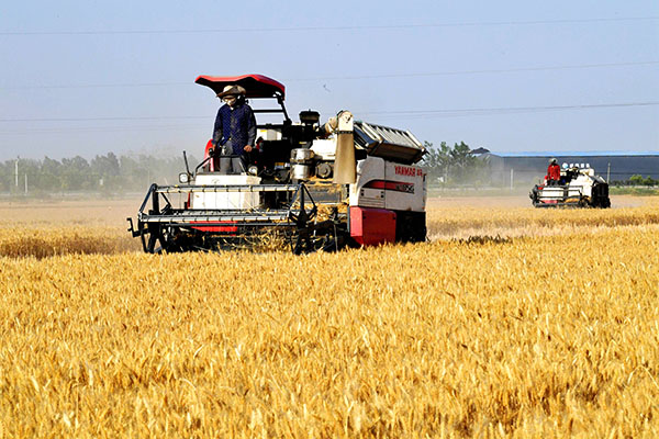 6月4日,怀远龙亢农场六分场,收割机在麦田内抢收小麦。连日来,我市各地紧抓晴好天气加快麦收进度,确保颗粒归仓。