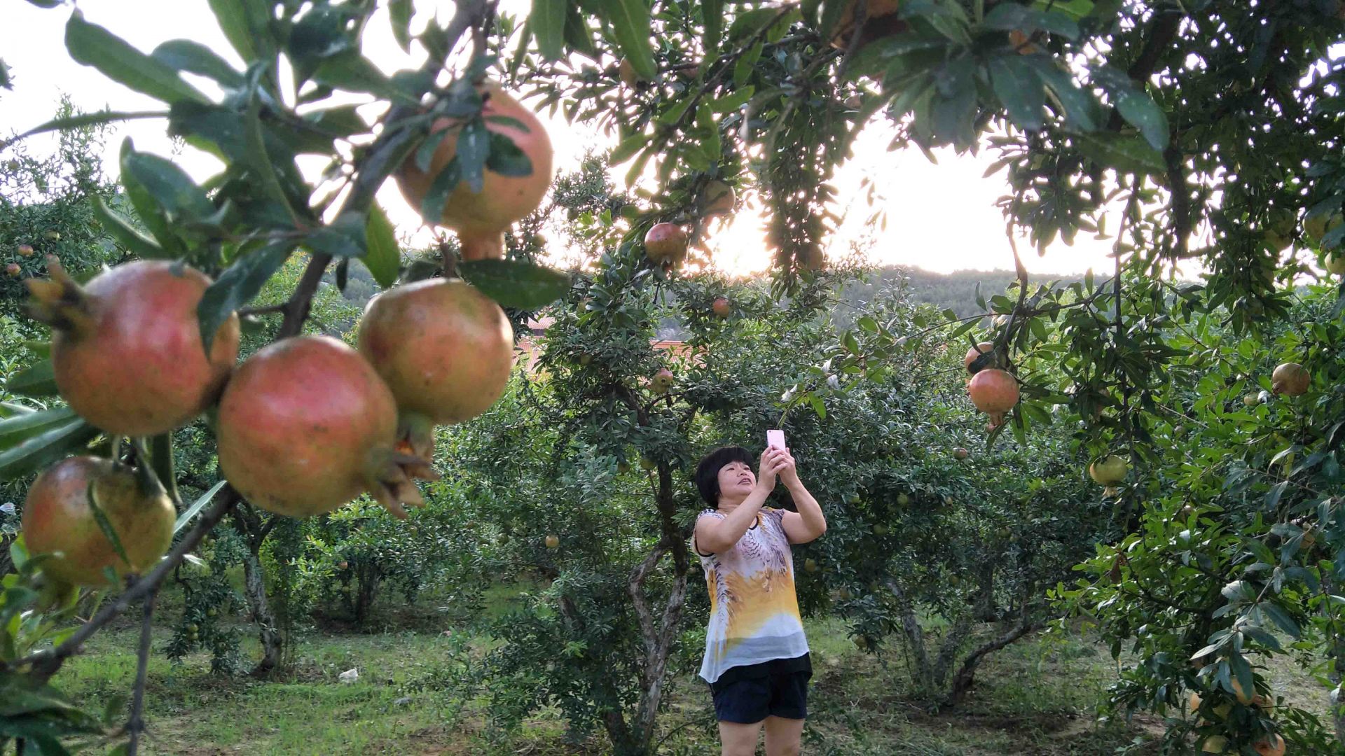 进入9月初,全国四大石榴产地之一的怀远县3.3万亩生态石榴树挂果累累,长势喜人,早熟品种白玉石籽、红粉皮等石榴近日即将采摘陆续上市,漫山遍野的榴园景色优美,成为淮河岸边的特色景点。图为日前,游人在怀远县荆山镇淮河岸边的白乳泉景区生态榴园观赏拍摄挂果满枝的石榴树。(完)
