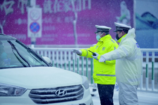 2月15日,蚌埠地区出现大雪降温恶劣天气,蚌埠交警各大队执勤民警和辅警在市区及高速公路各疫情防控检查卡点,冒雪执勤坚守在一线。 记者 陈昂 摄