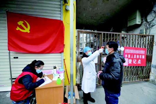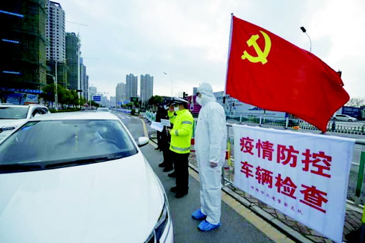 2月11日下午,解放路上,交警、市公安局交通分局的党员干部设卡进行体温测量、车辆登记。 记者 陈昂 摄