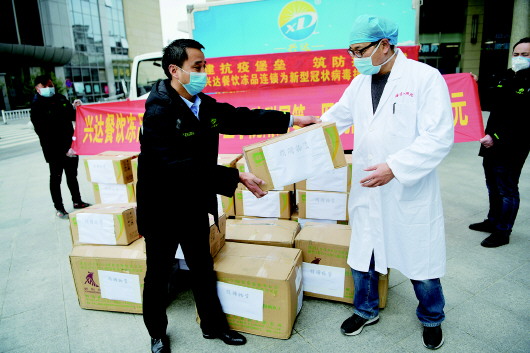 2月24日上午,蚌埠市兴达餐饮冻品连锁公司通过市慈善总会,向蚌埠医学院第一附属医院定向捐赠价值3万元的医用隔离服和价值2万元的冷冻食品。