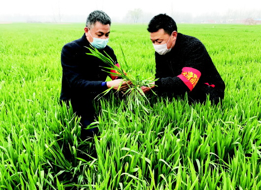 固镇县杨庙乡一手抓疫情防控,一手抓田间管理,调配农技人员进行农业生产辅导。图为乡疫情防控督查组对田间辅导进行再督查,做到抗疫田管两不误。