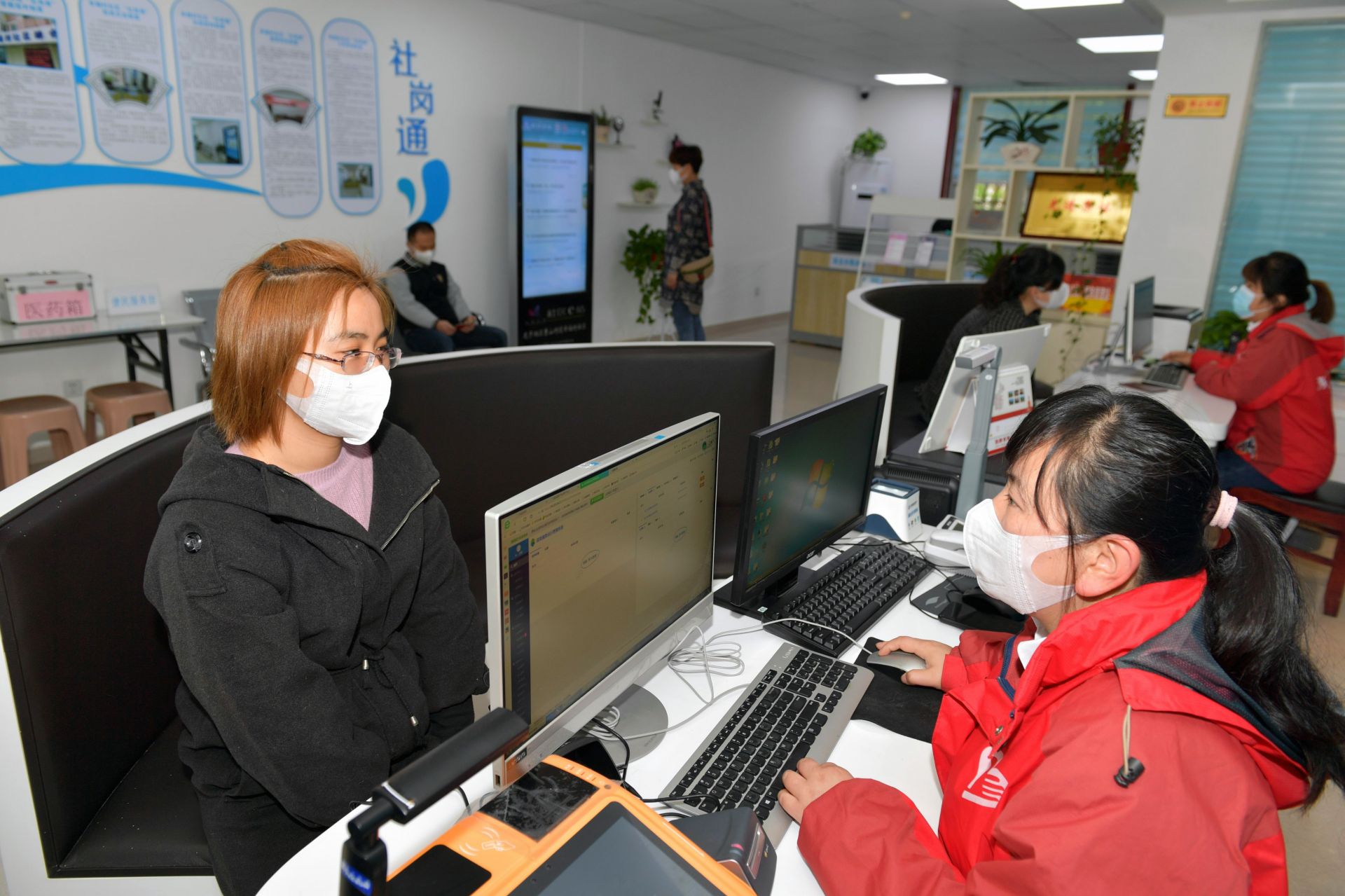 4月20日,曹山街道幸福村社区,身着志愿者服装的社区工作人员为前来办事的居民答疑解惑。2018年8月以来,龙子湖区借鉴“枫桥经验”中发动群众、依靠群众的做法,不断提升基层社会治理水平,在全区范围内选择7个基础条件好的社区作为试点,开展“社岗通”全科服务。随着“全科社工”模式的推广,真正做到了“一人受理、全程办理”。
