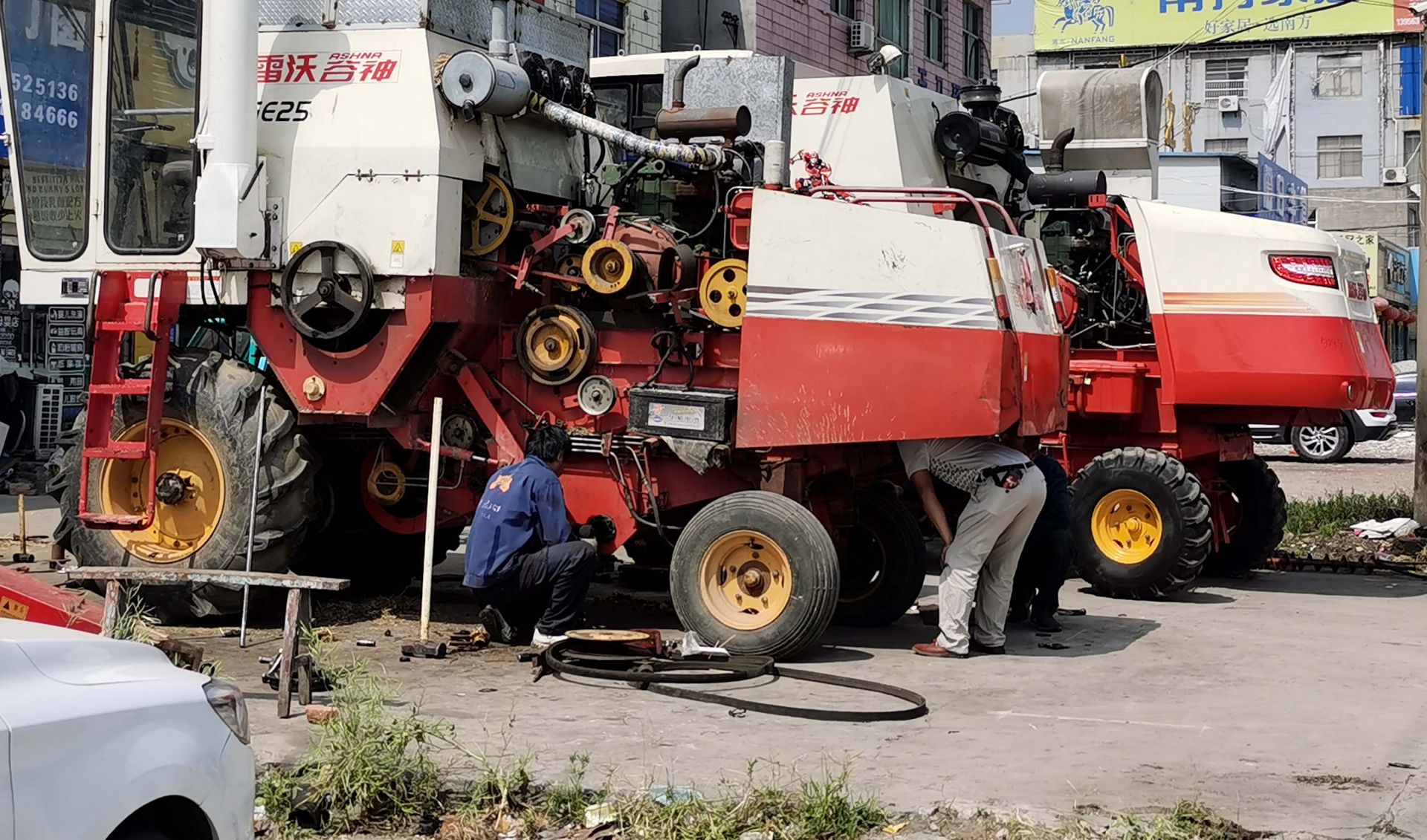 农机手在检修机械,做好夏收准备。叶胜利 摄