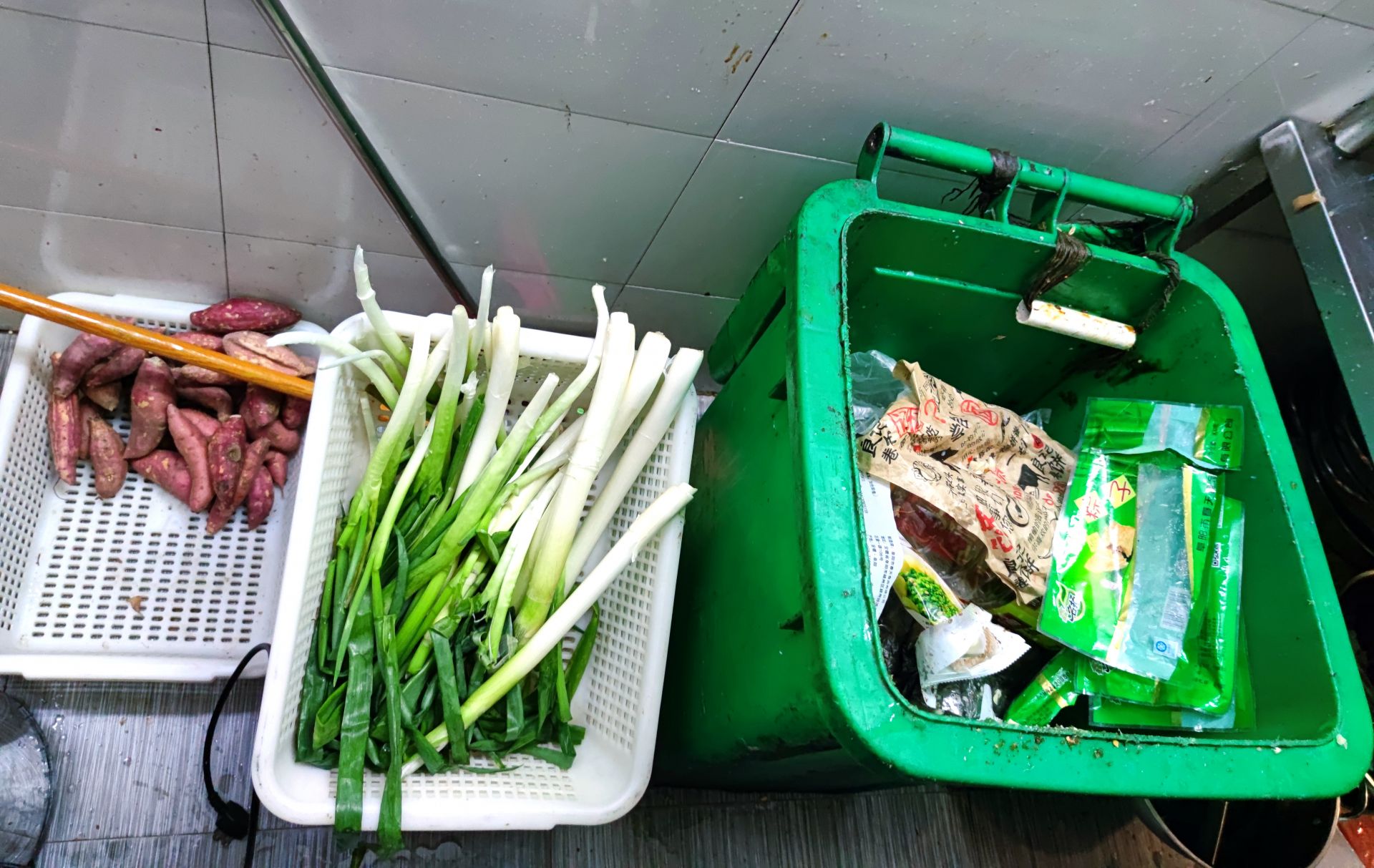 一餐厅垃圾桶未加盖,与地上的蔬菜紧挨在一起。