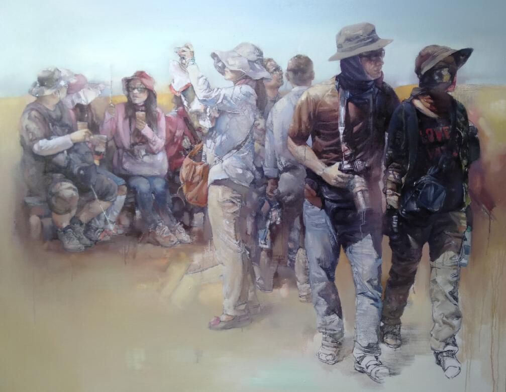 图片说明:创作创意:以人民群众在中国共产党的领导下,发奋图强,广大人民的生活水平发生了翻天覆地地变化,各种丰富的文化活动日益增多为创作背景,本作品就是描绘了人民群众带薪休假前往“嘉峪关”、“敦煌”旅游,观赏优秀文化传统和秀丽美景的场面,(作品为“嘉峪关”外的场景)。