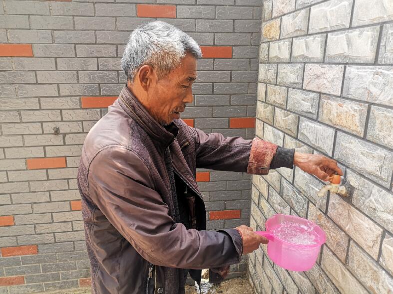 在固镇县杨庙乡松南村贫困户崔怀朋的家中,自来水管网已经安装入户,老崔打开水龙头,清澈的自来水就流了出来。