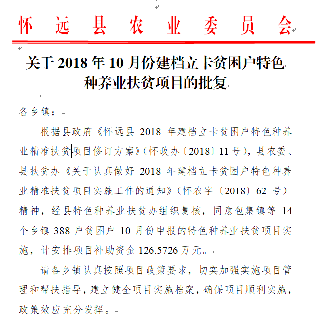 关于2018年10月份建档立卡贫困户特色种养业扶贫项目的批复