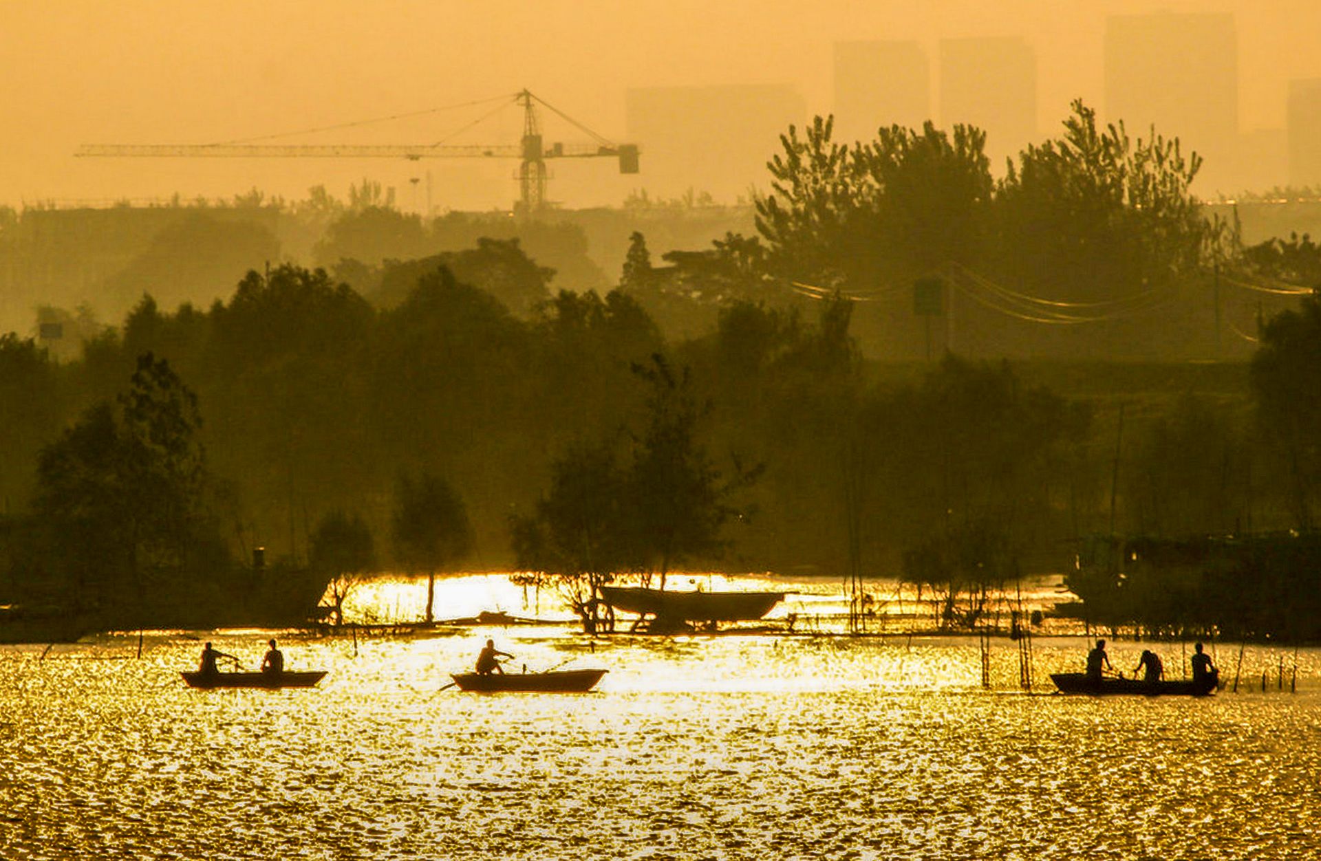 《渔歌晚唱》展示的是近处几首渔船在夕阳照射捕鱼,与远处的城市建设遥相呼应,好一派生机盎然的景色。该作品获第一届影像中国梦摄影中国行优秀奖。