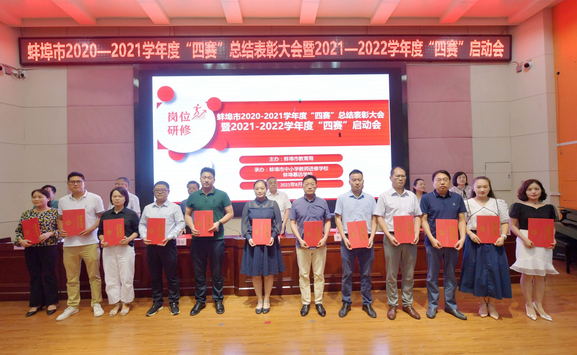 8月29日上午,蚌埠市2020—2021学年度“四赛”总结表彰大会暨2021—2022学年度“四赛”启动会在慕远学校报告厅举行。会上,隆重表彰了2020-2021学年度以“赛上课、赛命题、赛解题、赛成绩”为主要内容的教师岗位研修活动获奖教师、先进个人及单位,同时启动新一学年“四赛”活动。         记者 陈昂 摄
