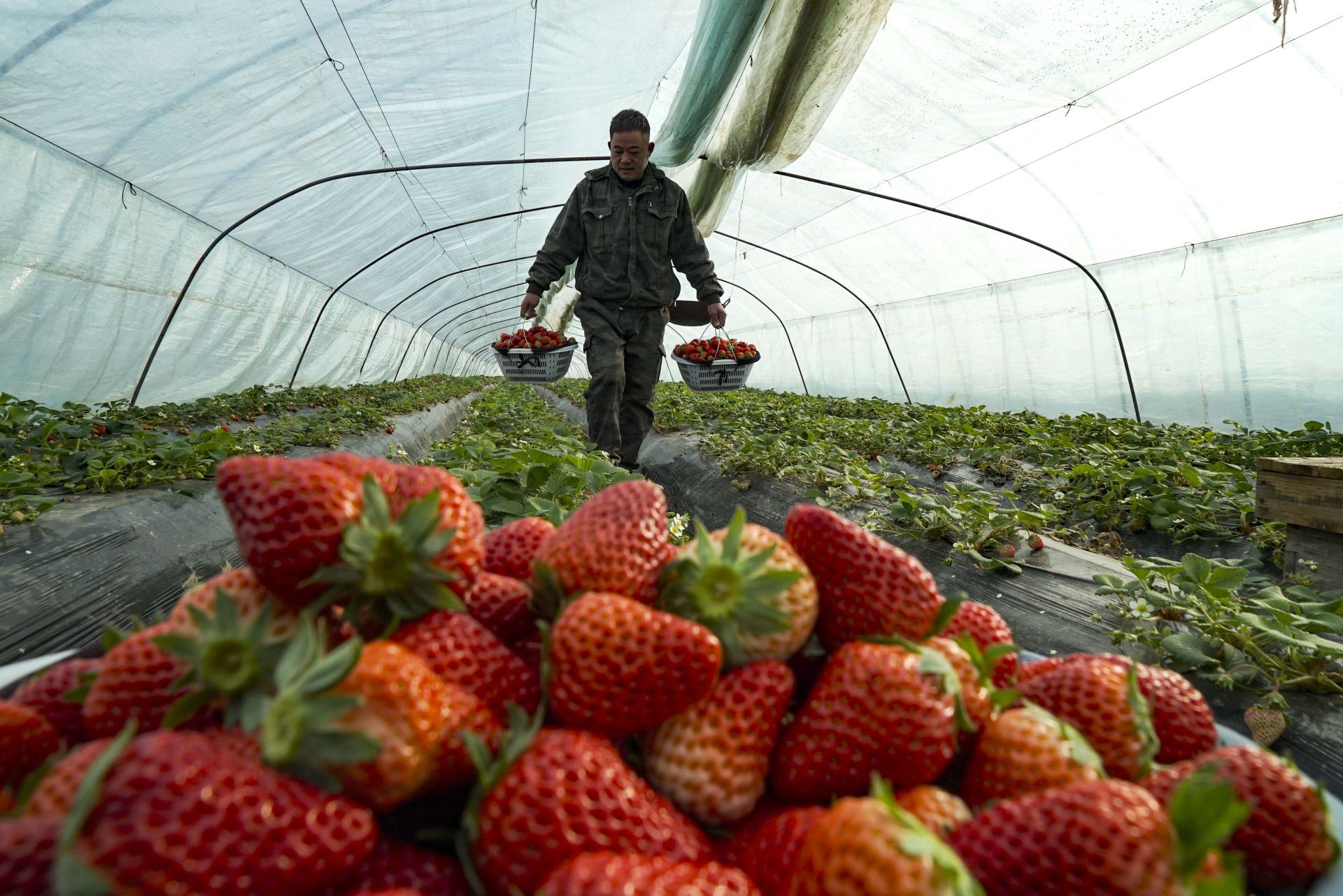1月16日,在五河县头铺镇紫梅家庭农场草莓生态园里,果农正在采摘草莓。去年,该生态园负责人陈利从外地引进了优良红颜和红灵芝草莓苗,经过科学管理,今年草莓长势喜人,不仅个头大、口感好,产量也较往年有大幅提高。目前,生态园共有草莓大棚32个,占地面积53亩,每亩产量可达5000斤左右,预计今年纯收入可达100万元。 李向前 摄