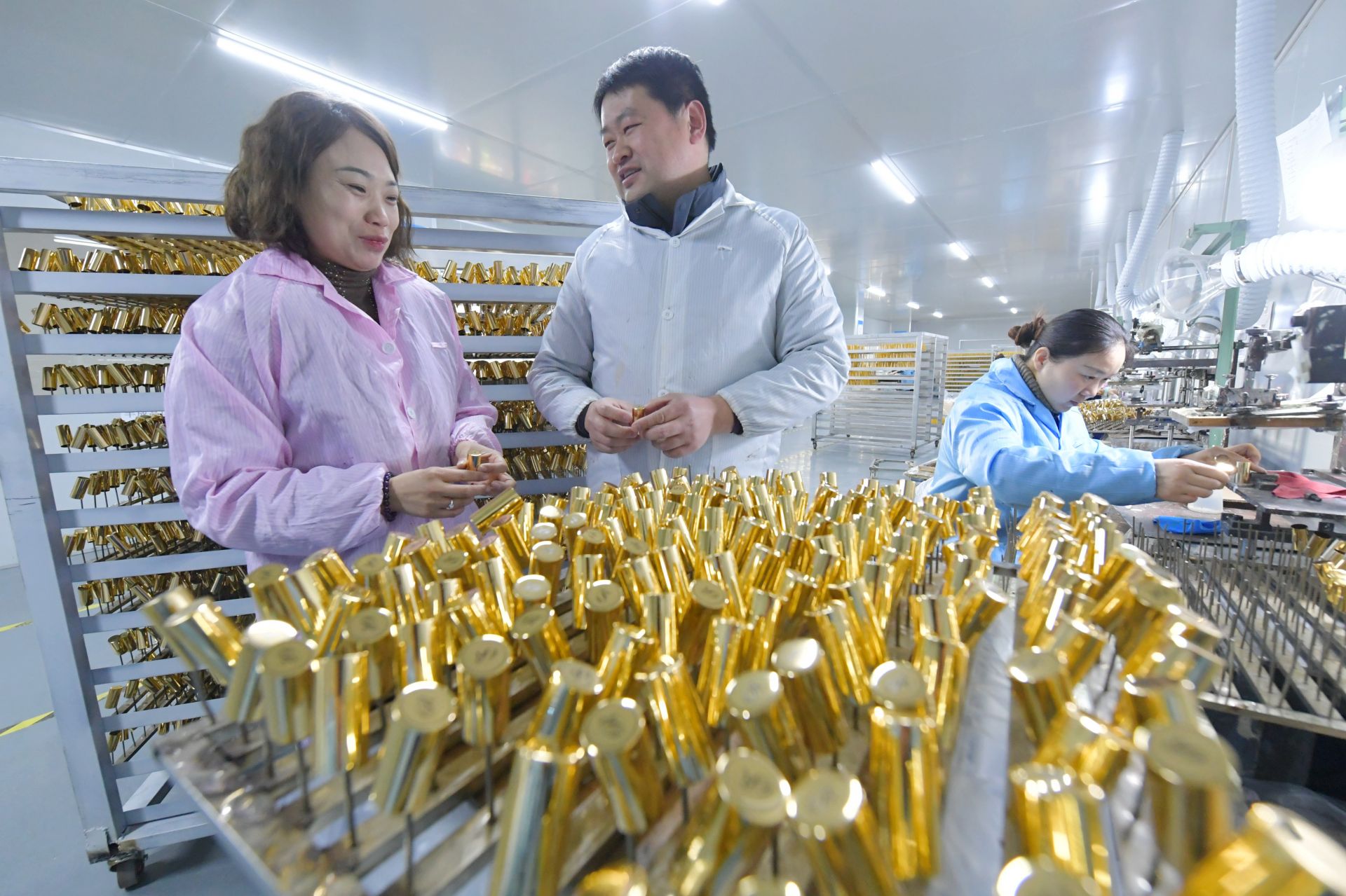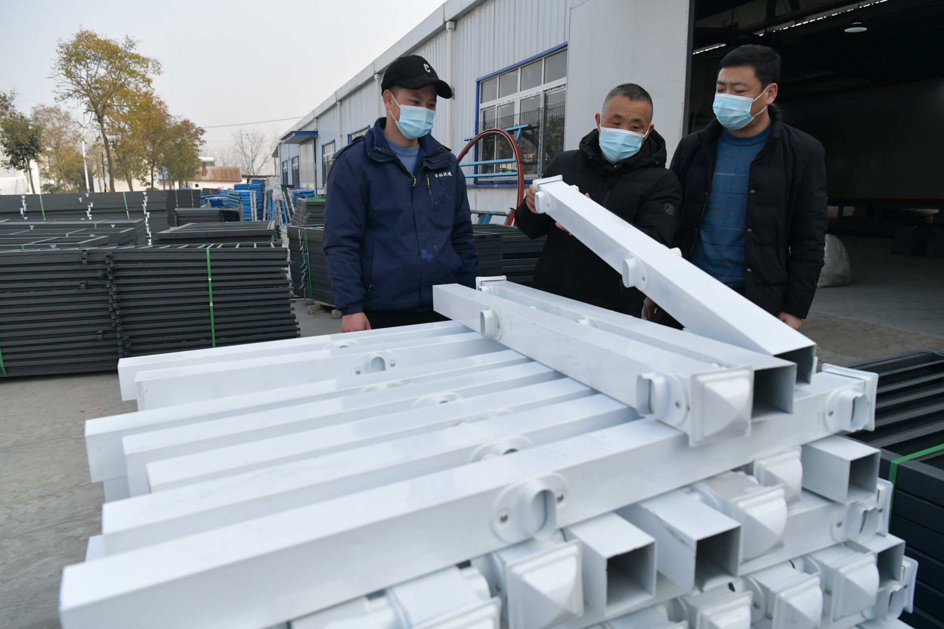 1月18日,固镇县连城镇禹庙村党支部第一书记、乡村振兴工作队长赵海(中),来到位于该村的安徽顾铭护栏有限公司了解销售情况,提醒生产主管注意规避市场风险。
