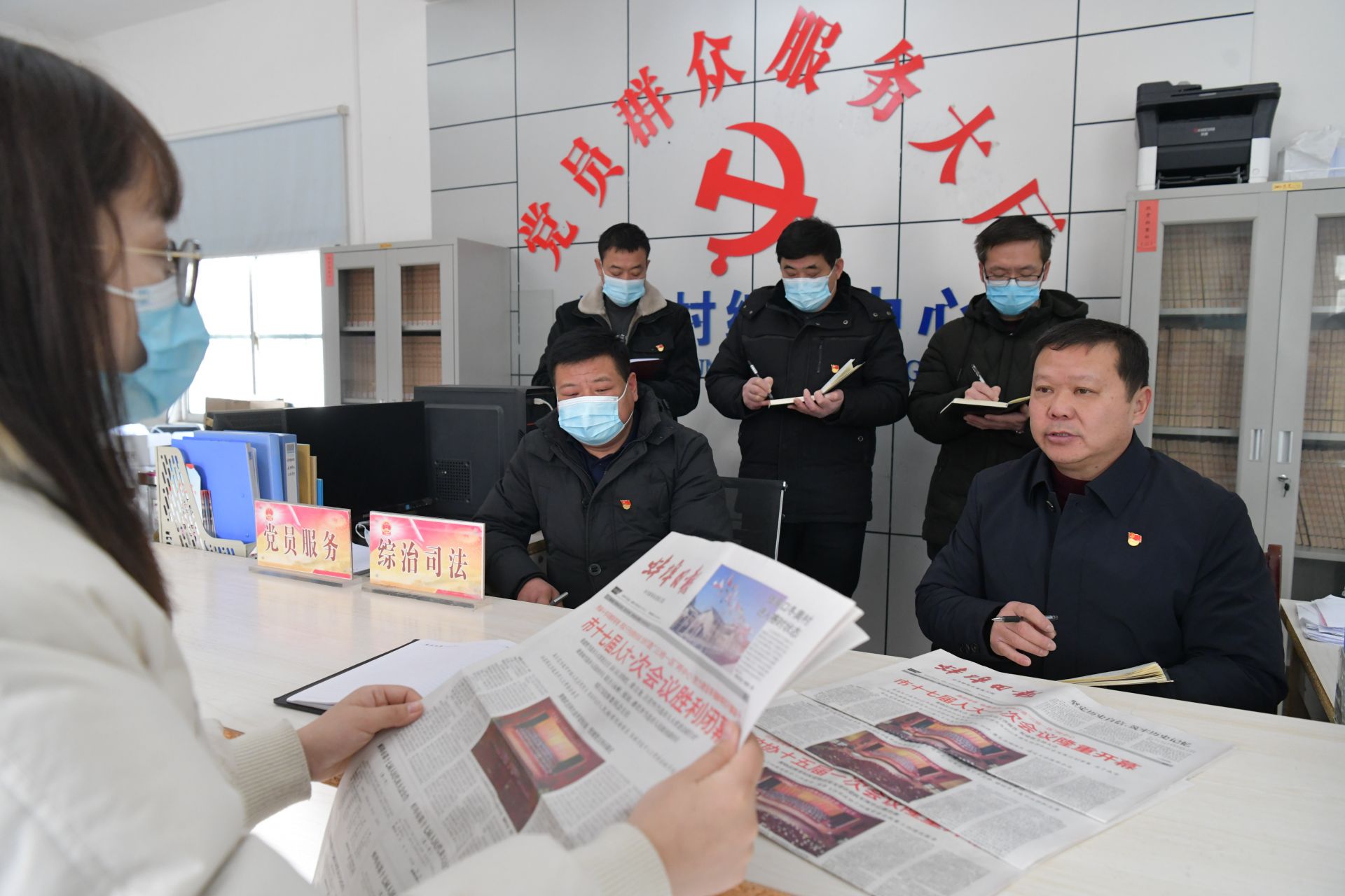 1月18日,固镇县刘集镇水上村党支部第一书记、乡村振兴工作队长王超(右一),向村两委成员宣讲市“两会”有关乡村振兴方面的精神。
