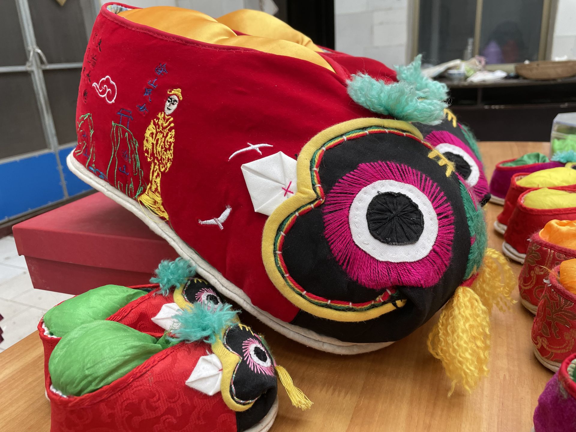 20220215001020长约36厘米的大号虎头鞋,右鞋上绣有涂山氏女。