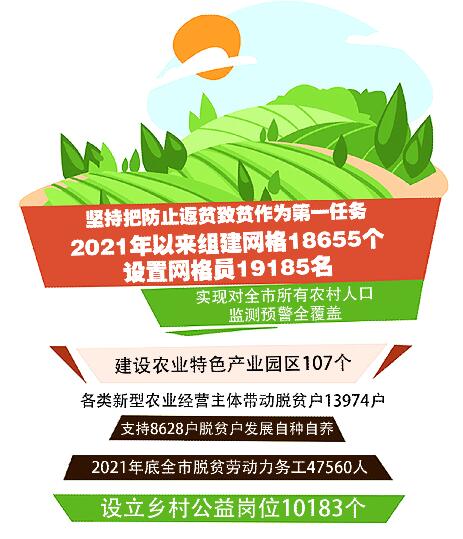 2021年以来,各县区各部门严格落实“四个不摘”要求,对摘帽县、出列村和脱贫人口扶上马送一程,保持现有帮扶政策、资金支持、帮扶力量总体稳定。把不发生规模性返贫作为巩固拓展脱贫攻坚成果的底线任务,建立了县、乡、村和村组四级防返贫网格化管理机制,按照每个网格覆盖20至40户农户要求组建网格18655个、设置网格员19185名,实现对全市所有农村人口监测预警全覆盖。新识别监测对象89户322人,全部落实“一户一方案、一人一措施”进行重点帮扶。无一例返贫和新致贫。
